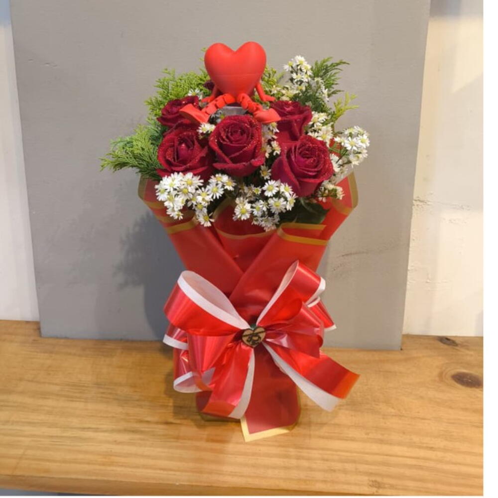 Um presente que fala por você! 💌 Este lindo buquê é composto por rosas vermelhas selecionadas, delicadamente combinadas com flores brancas e folhagens verdes que trazem leveza e sofisticação à composição. O grande destaque fica por conta do coração decorativo no topo, simbolizando amor, carinho e intensidade. A embalagem em tons de vermelho, finalizada com um laço volumoso e elegante, transforma o arranjo em uma verdadeira declaração de sentimentos. ✨ Ideal para: Surpreender quem você ama Datas especiais Pedido de namoro Aniversário de relacionamento Dia dos Namorados Um buquê apaixonante, pronto para emocionar e tornar qualquer momento inesquecível.