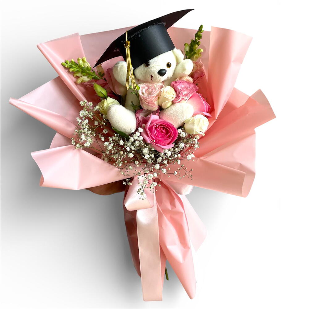 Delicado buquê que simboliza a conquista de uma nova etapa na vida. Composto por um ursinho de pelúcia com capelo, rosas e demais complementos.