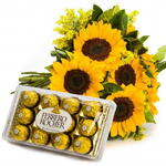 Este presente incrível combina a beleza de seis girassóis deslumbrantes, complementados pela folhagem fresca e um laço elegante, juntamente com uma caixa do lendário Ferrero Rocher com doze unidades. Uma combinação perfeita de um arranjo floral exuberante e doce indulgência, é mesma o mimo perfeito para demonstrar o seu carinho e amor!