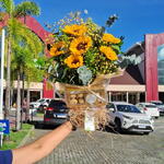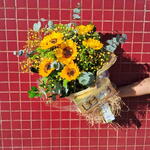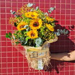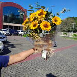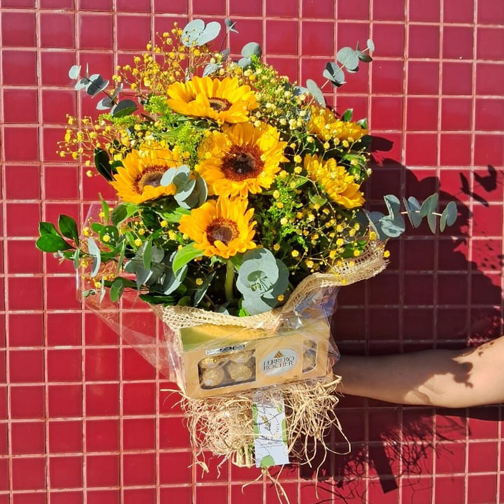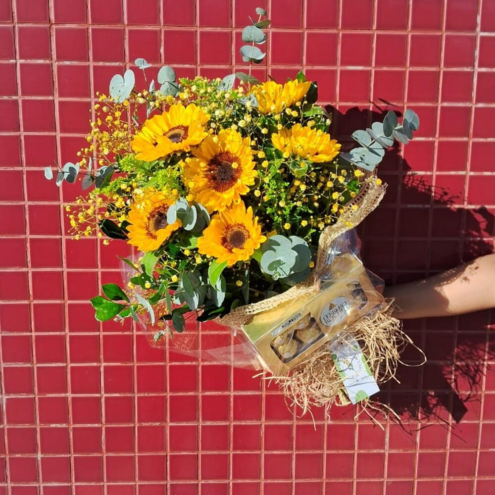 Esse autêntico buquê é composto por girassóis, acompanhado de um delicioso chocolate(Ferrero Rocher), para docear ainda mais a sua surpresa. Complementando a composição, temos uma unidade de Gypson, coordenadamente pintado de amarelo, e uma unidade de refrescante e aromático eucalipto. E não podemos esquecer da rústica e charmosa unidade de rusgo. Para a perfeita apresentação, o buquê é envolto em uma elegante embalagem de juta junto com papel transparente, garantindo a exibição do seu encanto, e finalizado com um laço, dando um toque especial ao presente.