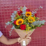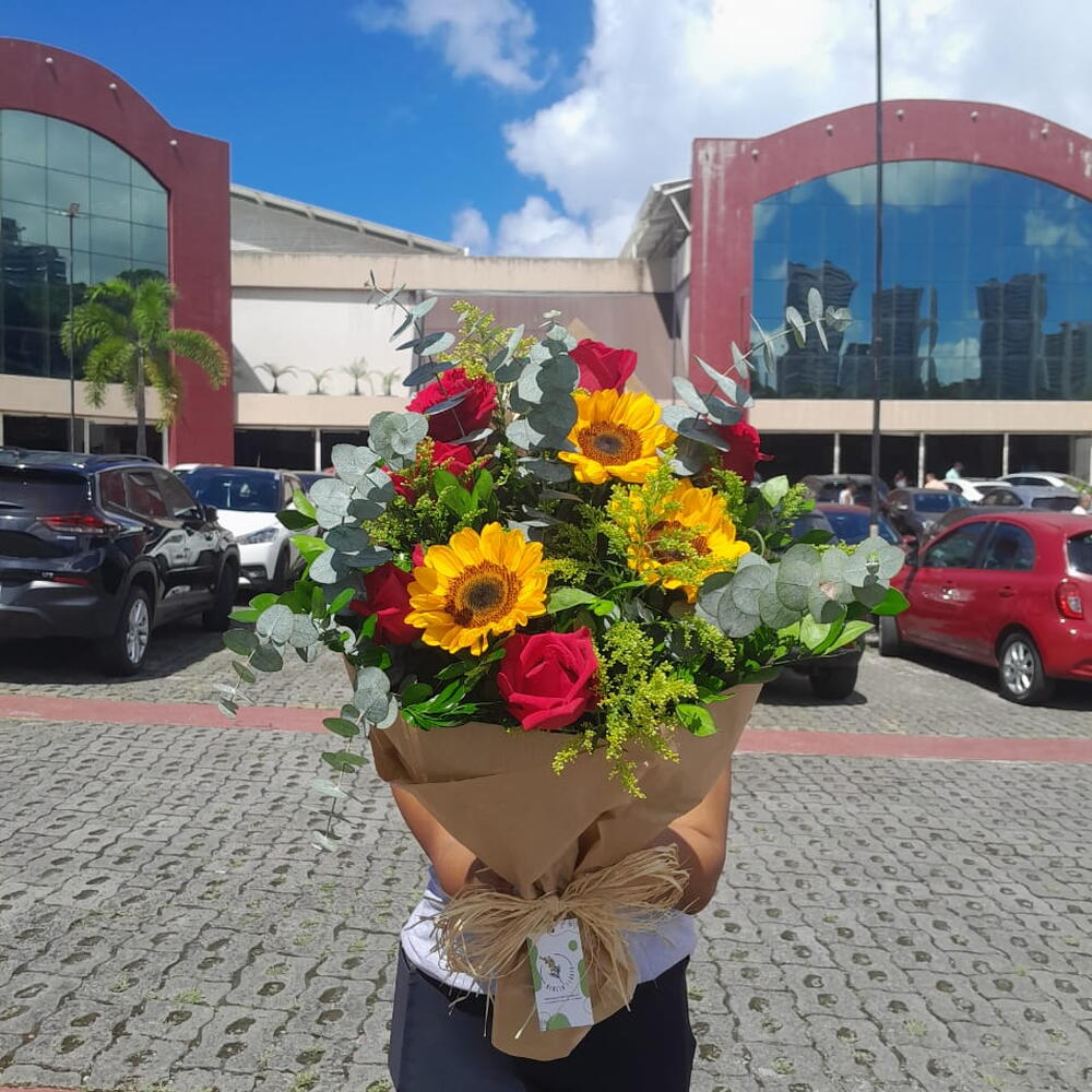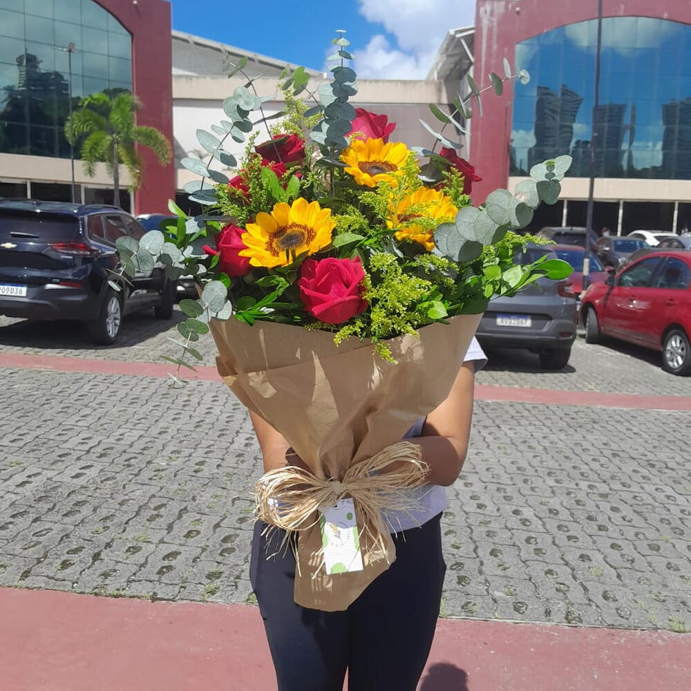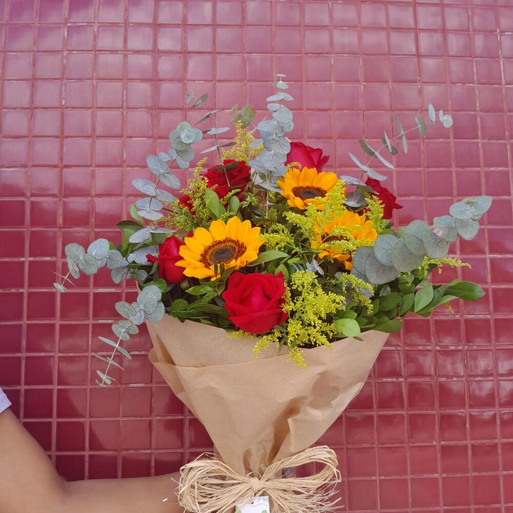 Este elegante buquê é uma verdadeira obra de arte, composto por girassóis que adiciona um toque de alegria e positividade. As rosas acrescentam uma dose de amor e delicadeza, enquanto o tango traz um pouco de exotismo. O eucalipto adiciona um toque fresco e a embalagem de Kraft garantem um visual rústico e elegante ao mesmo tempo. Finalizado com um belo laço. Perfeito para presentear em qualquer ocasião.