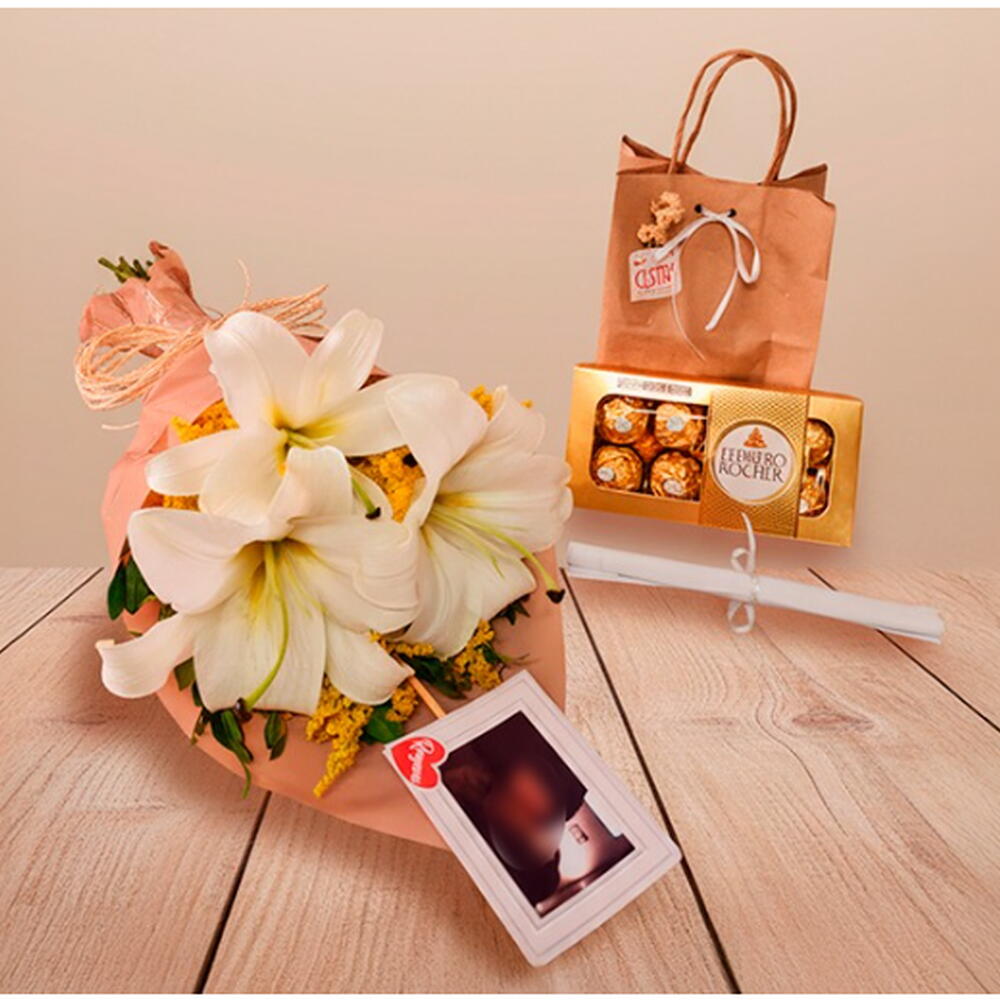 3 lírio em sua cor de escolha - 1 pcs 1 caixa de ferrero rocher com 8 unidades - 1 pcs