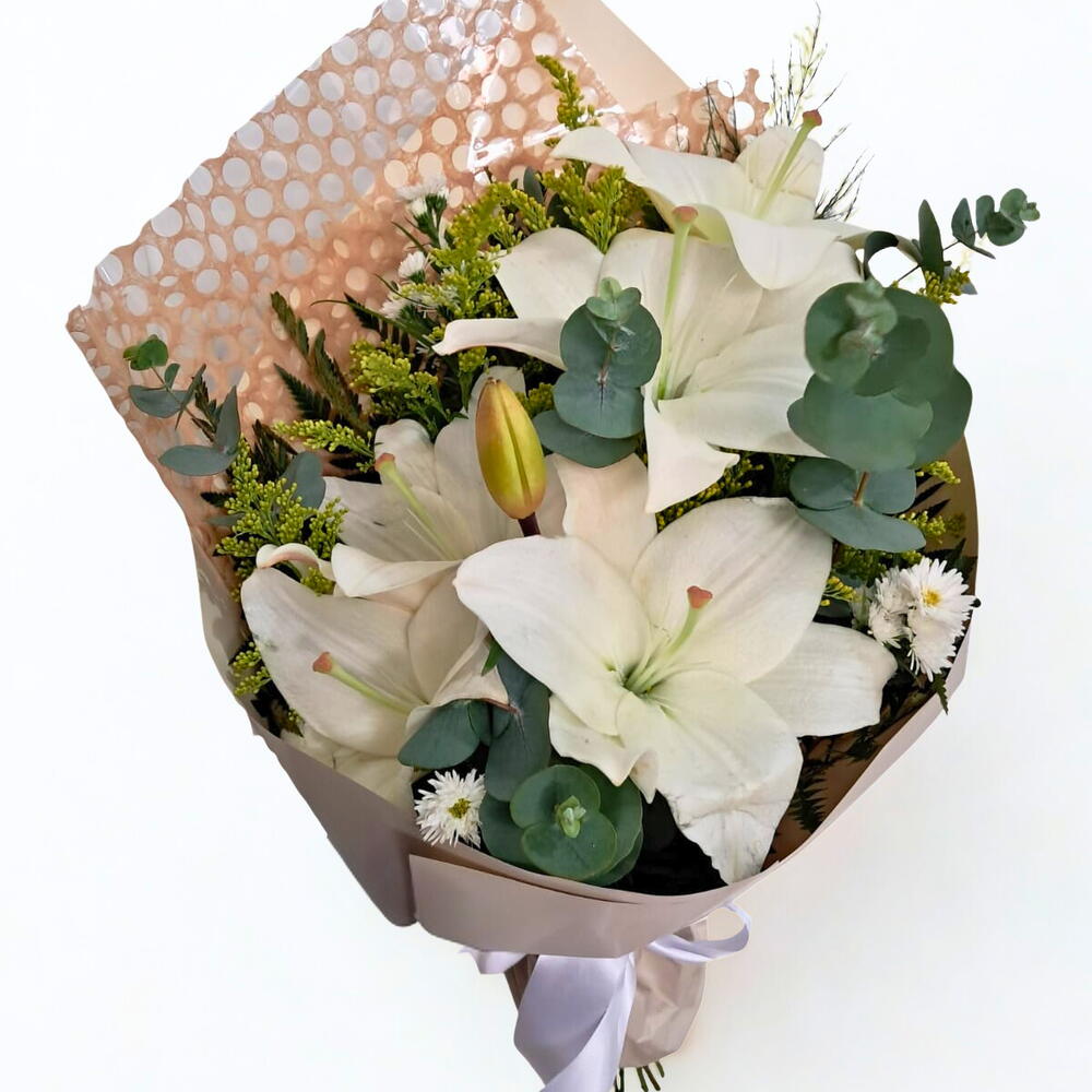 Este buquê requintado é composto por 4 deslumbrantes lírios, complementado com uma unidade de folhagens verdejantes. Cada buquê é habilmente arranjado à mão e envolto em uma embalagem de design sofisticado, adicionando um toque final com um encantador laço. Este buquê irá adicionar um toque de elegância a qualquer ocasião.