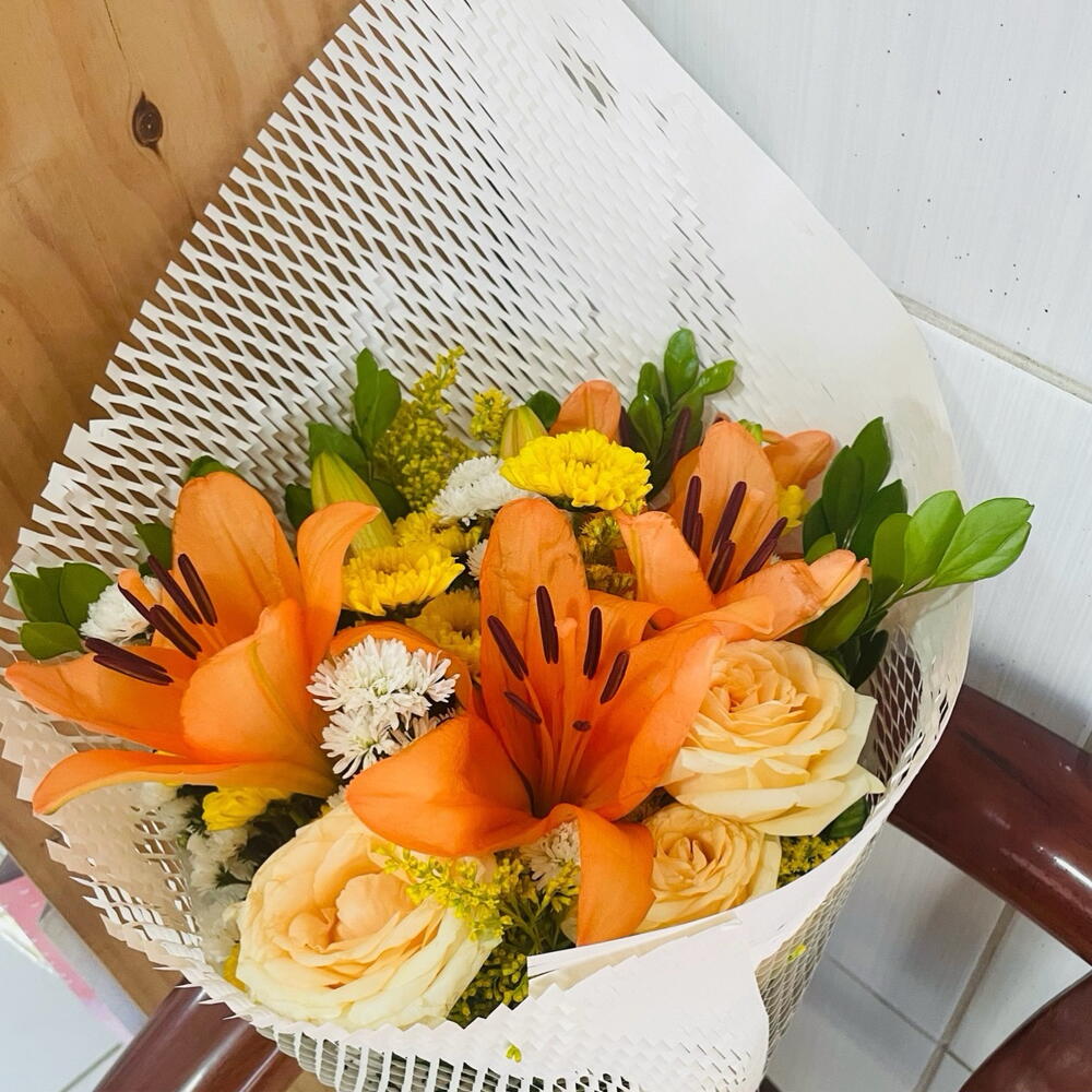 Este lindo buquê combina a elegância dos lírios com a beleza das rosas, formando uma harmonia perfeita de cores e formas. Os seis exemplares de folhagens acrescentam um toque natural e vibrante, enquanto a embalagem cuidadosamente selecionada protege e realça a beleza das flores. Completa com um laço delicado, este buquê é a escolha ideal para transmitir sentimentos de amor, gratidão e alegria, seja qual for a ocasião.