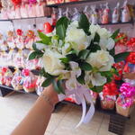 rosa branca - 6 pcs astroméria branca - 4 pcs laço em cetim - 1 pcs