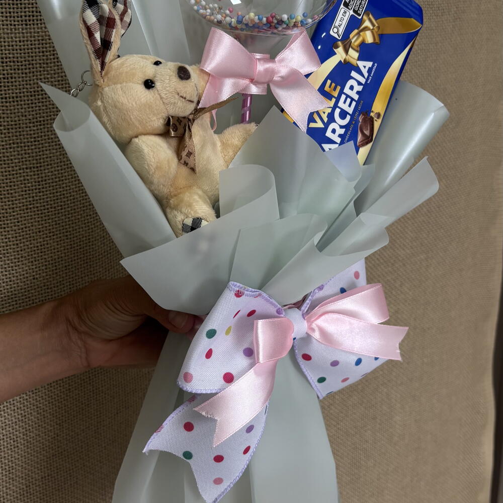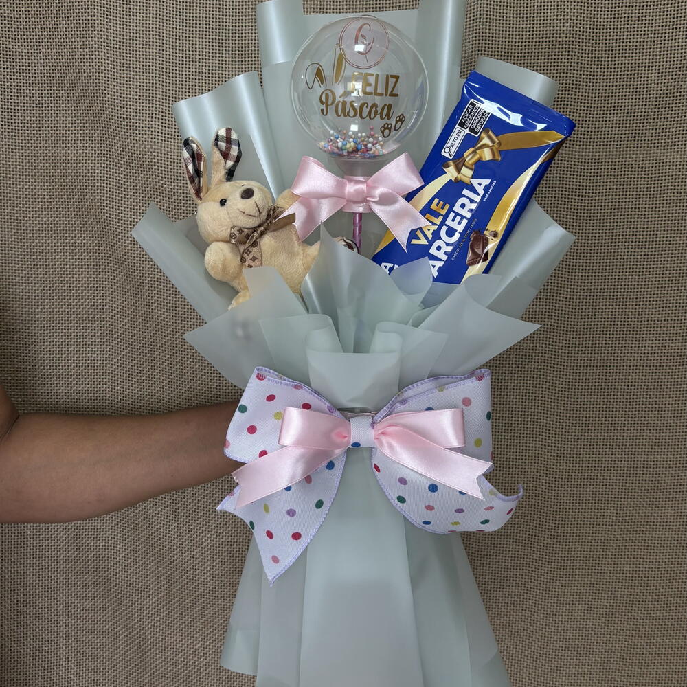 barra de chocolate - 1 pcs buquê decorado - 1 pcs bubble personalizado 5’ - 1 pcs