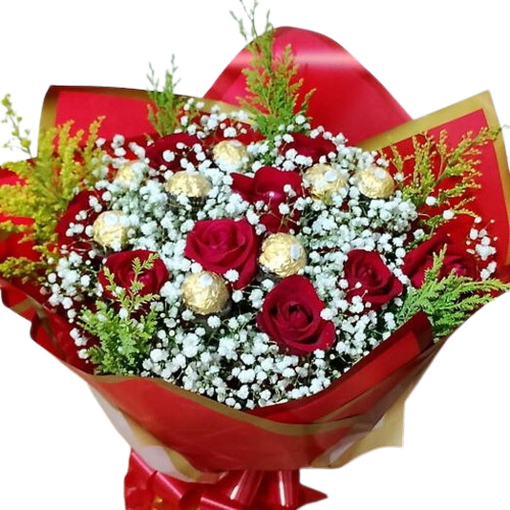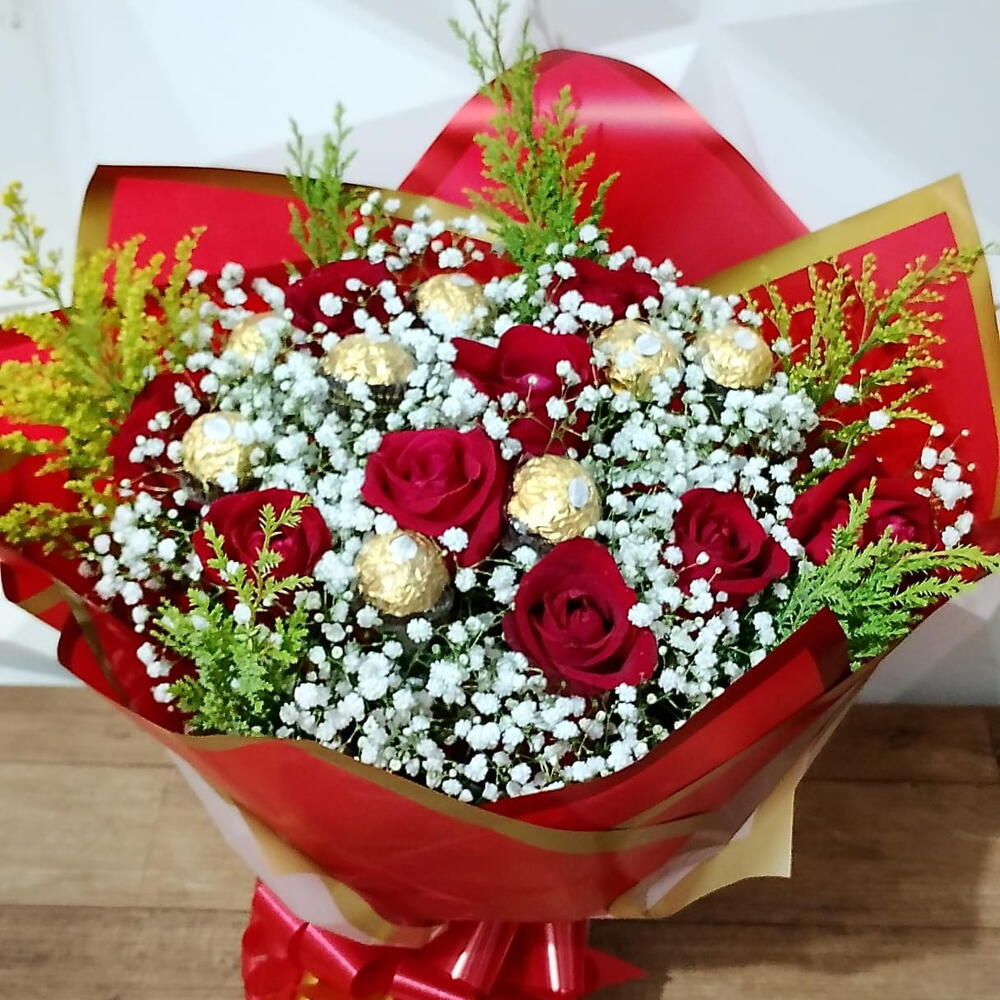 Surpreenda a pessoa amada com este presente requintado. Composto por 10 rosas vermelhas, acompanhadas por um detalhe sofisticado de complemento de folhagem. Para adoçar o gesto, a oferta é completada com 8 deliciosos chocolates Ferrero Rocher. É a combinação perfeita de romance e indulgência, ideal para todas as ocasiões especiais.