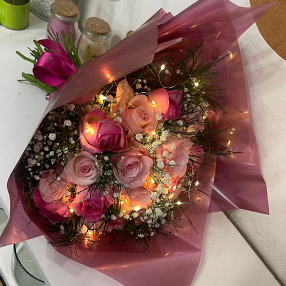 Este requintado buquê é composto por 18 belas rosas em tons de rosa, lilas e pink, cuidadosamente dispostas entre as verdes folhagens e enfeitadas com um leve toque de gipsófila. A iluminação suave do fio de fada LED dá um charme especial, enquanto a embalagem moderna ressalta a beleza do arranjo. Um delicado laço completa o visual, tornando-o um presente perfeito para momentos especiais.