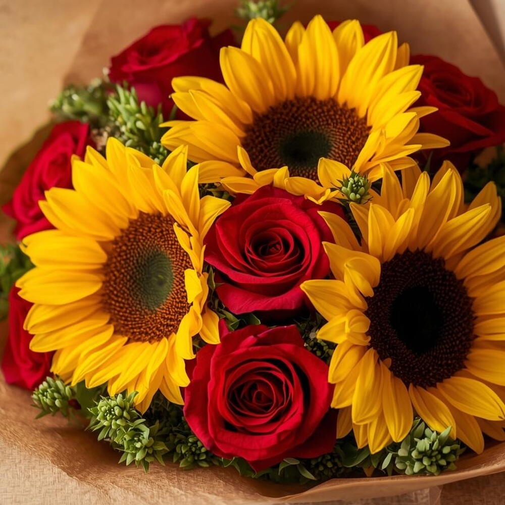 Este deslumbrante buquê é uma combinação vibrante de 3 girassóis brilhantes e 6 rosas vermelhas luxuosas, adornadas com folhagens encantadoras. Cada buquê é habilmente embalado e finalizado com um laço elegante para garantir que ele chegue em perfeitas condições. Perfeito para expressar paixão e admiração, e para iluminar o dia de alguém. Ideal para celebrar aniversários, aniversários ou apenas para mostrar o quanto você se importa.