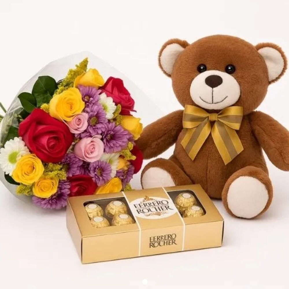 laço especial - 1 pcs celofane embalagem - 1 pcs ferrero rocher cx. 8 unidades - 1 pcs ursinho importado 25cm - 1 pcs buquê 12 rosa e margaridas coloridas - 1 pcs