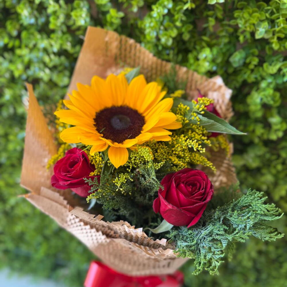 Deleite-se com um magnífico buquê, que combina a intemporal elegância de 3 rosas suavemente contrastadas com a vivacidade de um único girassol. Completo com delicadas folhagens e uma sofisticada embalagem artesanalmente amarrada com um laço, este buquê foi cuidadosamente criado para expressar seu afeto e admiração.