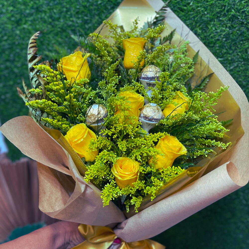 Este buquê é composto por 7 deslumbrantes rosas amarelas que simbolizam amizade e alegria. Acompanhando as flores, você encontrará um saboroso Ferrero Rocher (pacote de 3 unidades), perfeito para adoçar ainda mais o momento. Para completar este gesto de carinho, o buquê inclui Tangos e folhagens, que dão um toque verde e vibrante ao arranjo. Tudo isso é delicadamente embalado e amarrado com um belo laço para apresentação perfeita. Este produto é ideal para surpreender e encantar em qualquer ocasião!