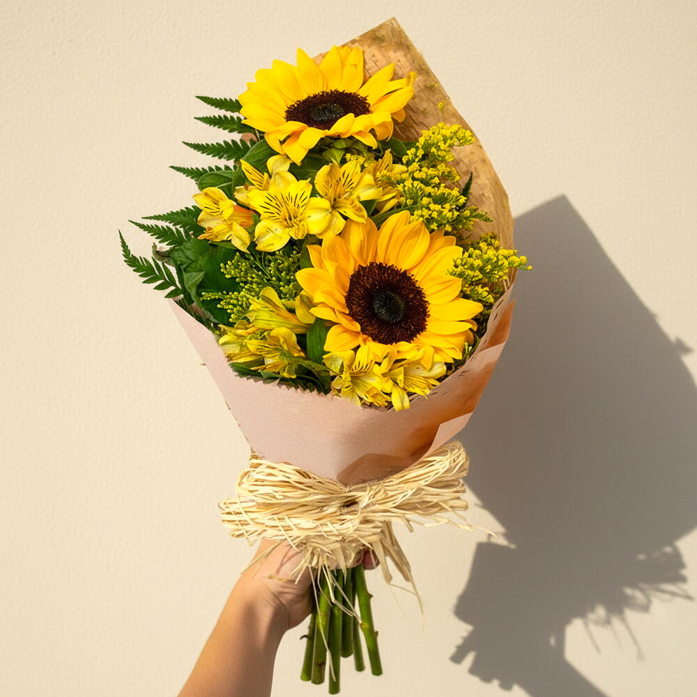 Este adorável buquê é meticulosamente montado com uma unidade de exuberantes folhagens, dois girassóis vibrantes e duas unidades de encantadoras astromelias. O charme rústico é acentuado por um laço também rústico e uma embalagem artesanal feita de kraft, tornando este buquê uma opção atraente para qualquer ocasião.