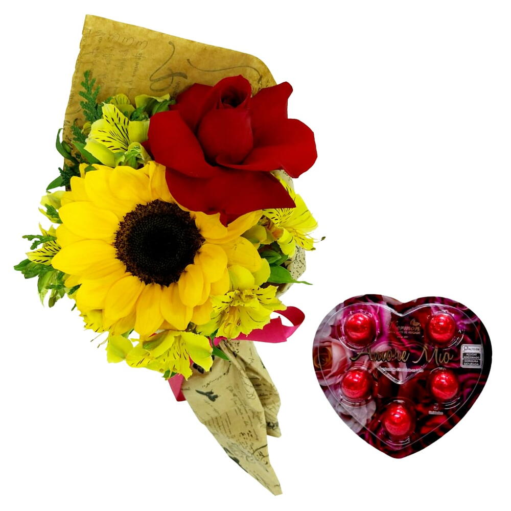 Buque composto por 1 girassol e 1 rosa vermelha. Acompanha chocolate Viermon em formato de coração