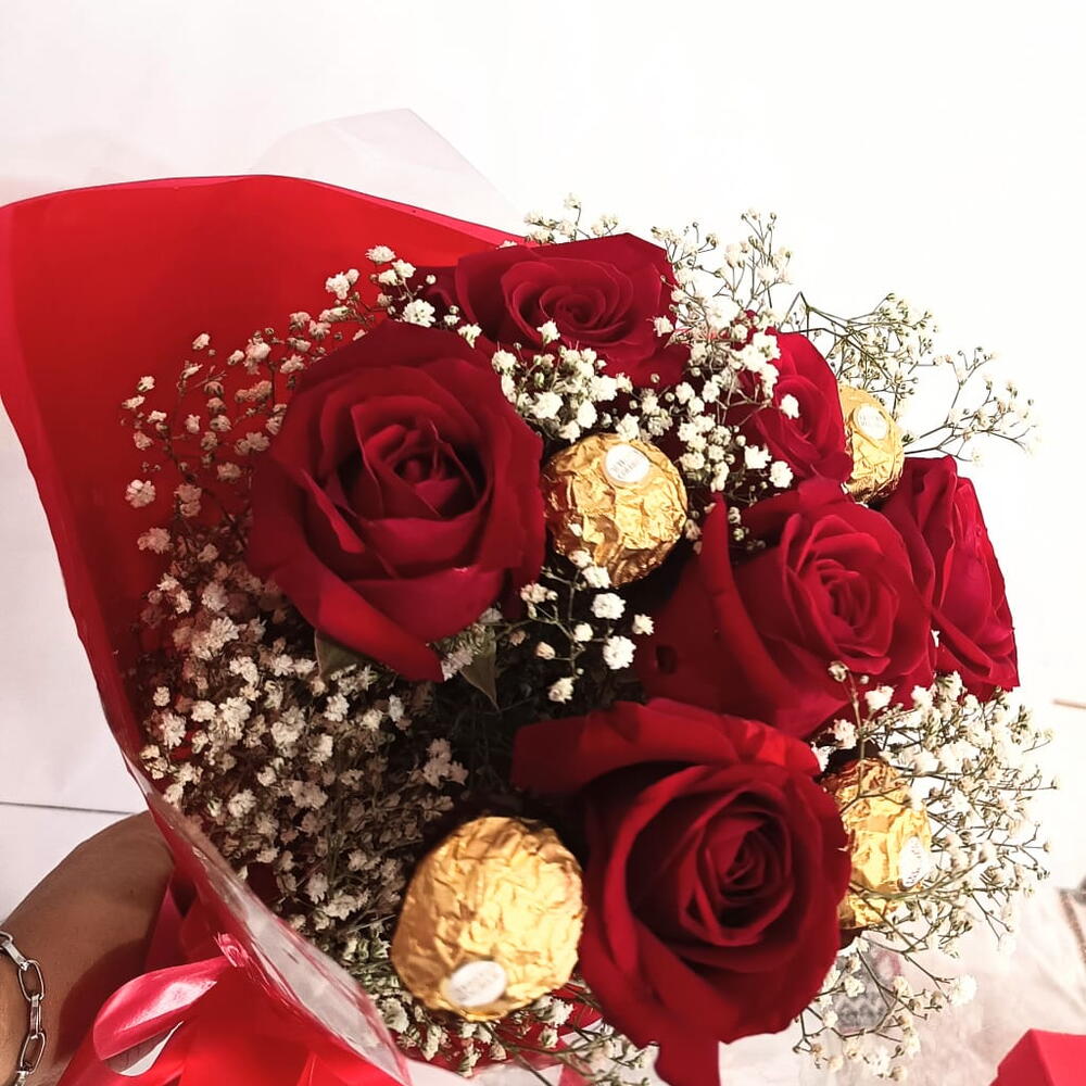 Buquê de rosas 12 unidades Ferrero Rocher 8 unidades Cortesia cartão de mensagem