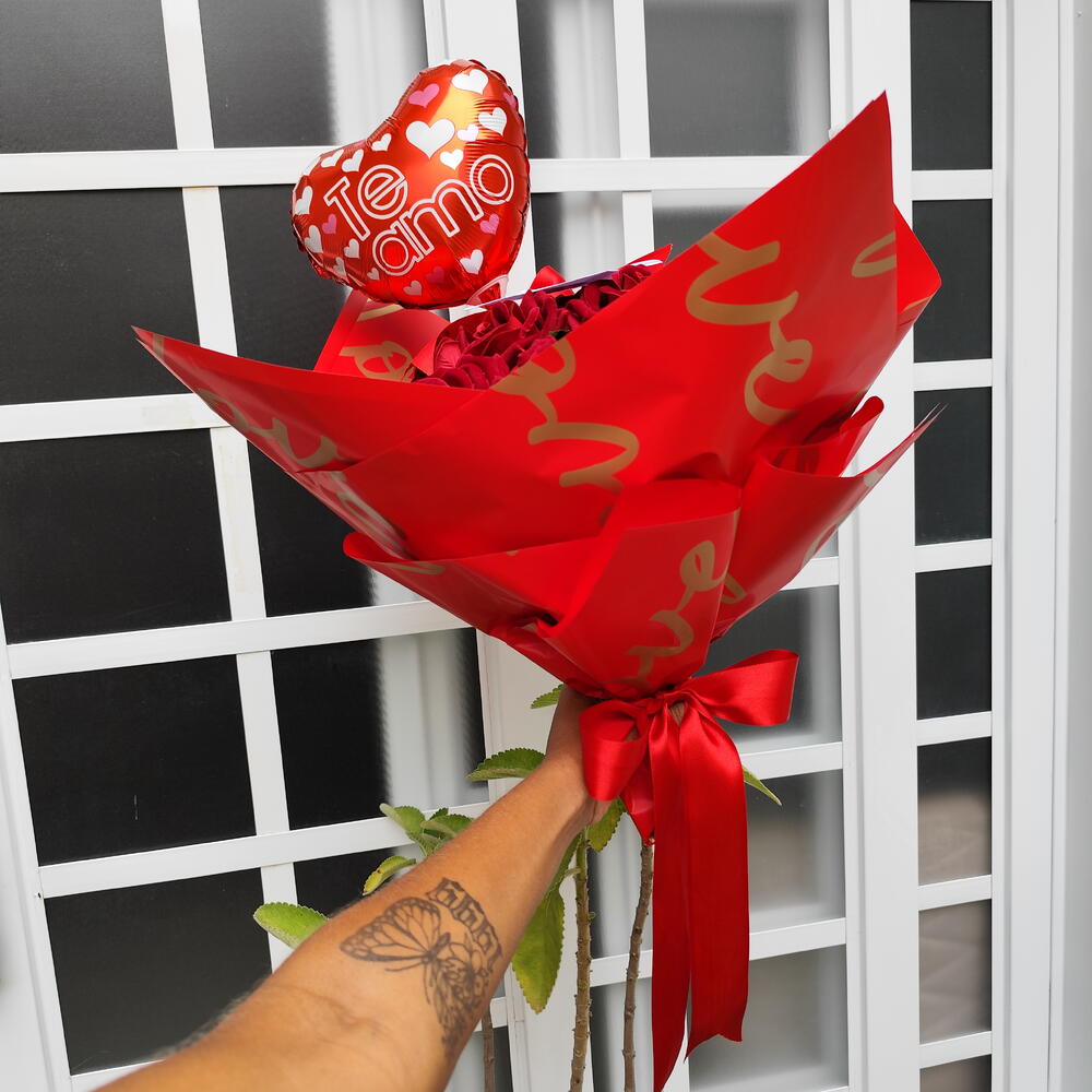 Buquê de flores permanentes – G + Pelucia, Balão coração e Bilhete
