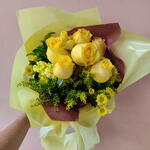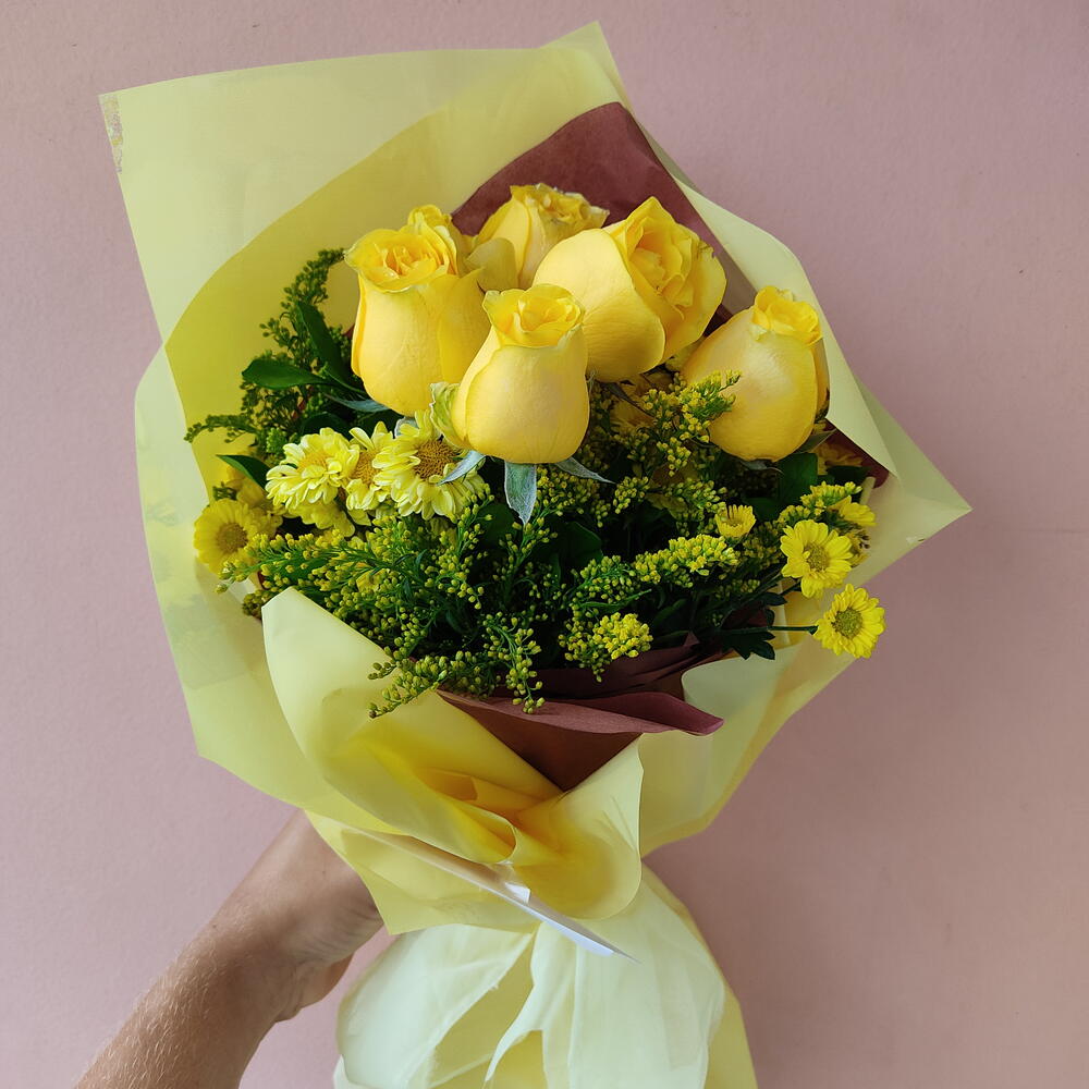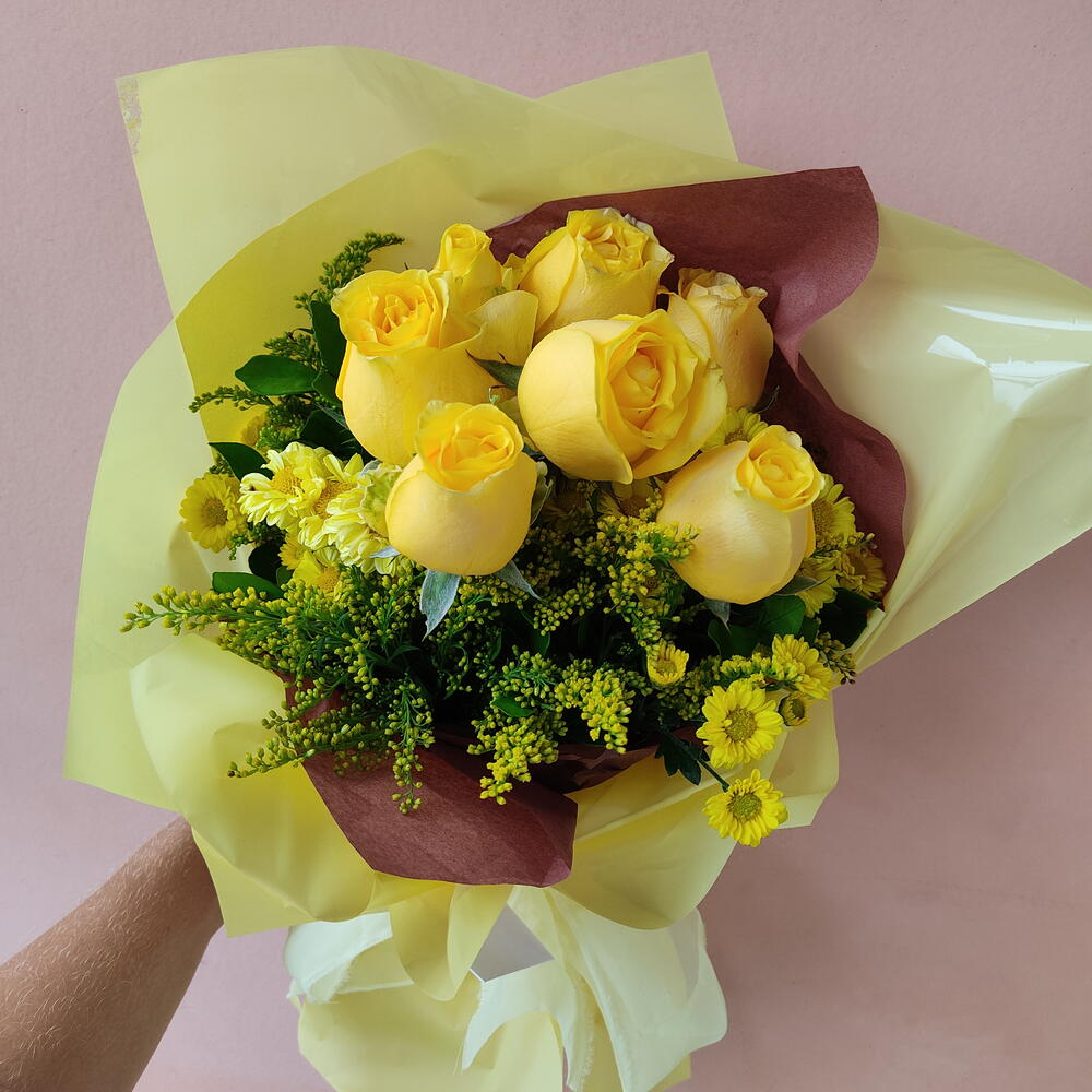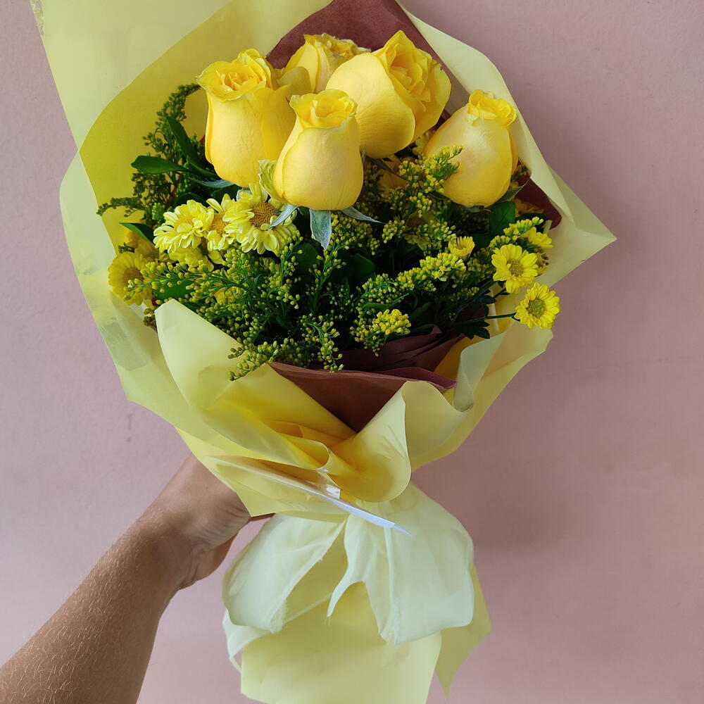 Este buquê é verdadeiramente uma obra de arte floral, composto por 6 rosas amarelas vibrantes, cuidadosamente selecionadas. Cada rosa é realçada por folhagens frescas e complementada com uma elegante embalagem, finalizada com um laço charmoso. Perfeito para expressar amor, respeito ou apenas para alegrar o dia de alguém.