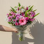 Este lindo buquê é composto de uma única unidade de folhagens e flores em tons de rosa. Ele vem elegantemente embalado, acompanhado de um laço rústico para adicionar um toque de charme rústico. Por favor, verifique a disponibilidade das flores em tons de rosa. Este buquê é a representação perfeita do amor e da beleza, ótimo para presentear alguém especial ou para embelezar a sua casa.