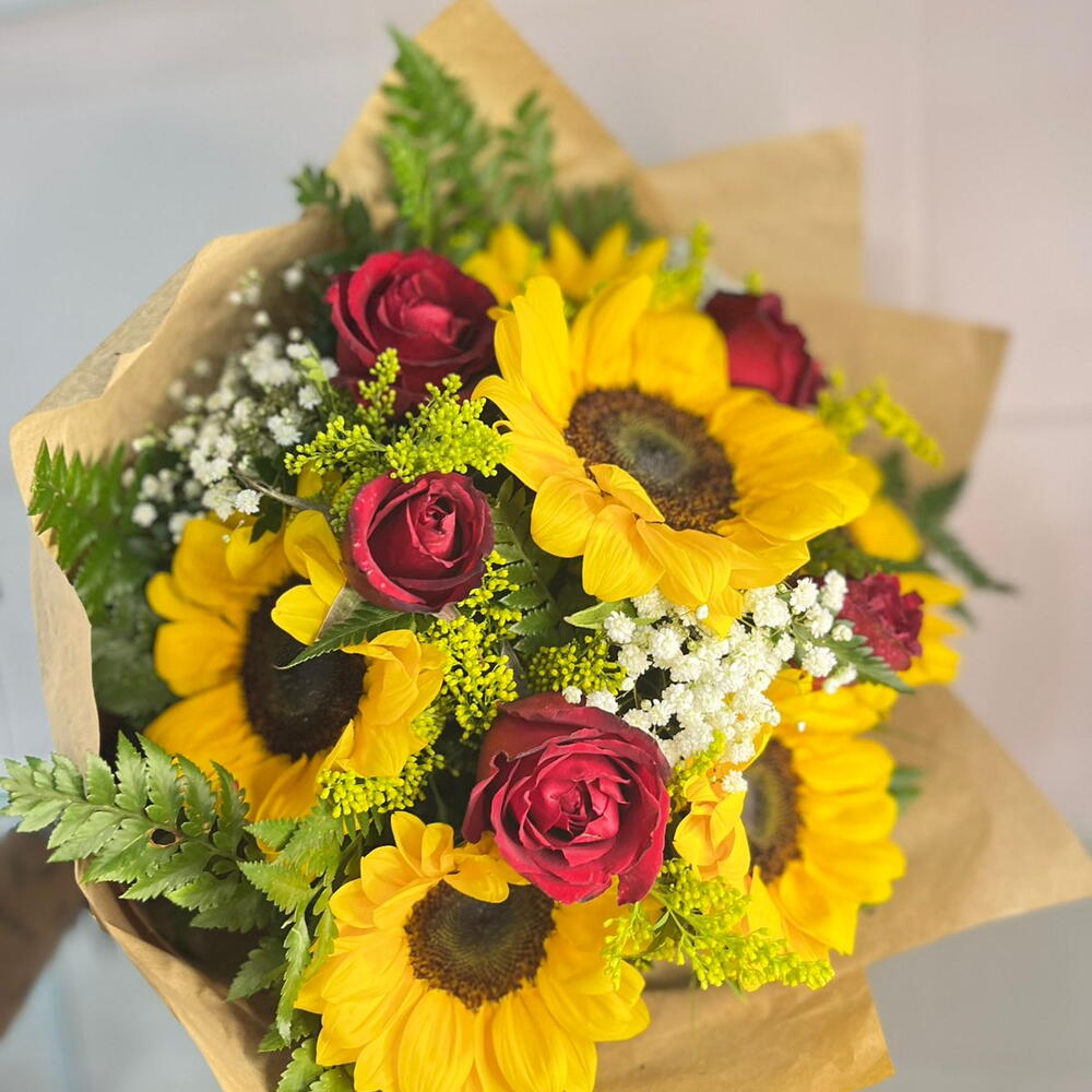 Este deslumbrante buquê é composto por 4 girassóis vibrantes, simbolizando alegria e admiração, bem como 5 rosas clássicas representando amor e respeito. Juntos, criam uma combinação mágica que não só agrada à vista, mas também transmite uma mensagem especial. Indicado para presentear em datas especiais, declarações de amor ou apenas para alegrar o dia de alguém querido.