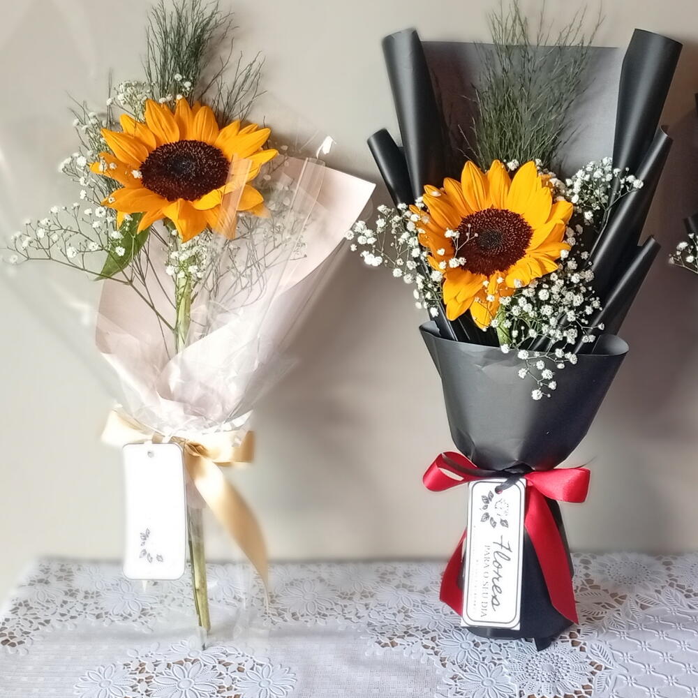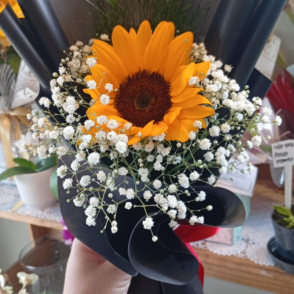 gypsophila - 3 pcs girassol - 1 pcs aspargo verde - 1 pcs embalagem coreana preto fosco ou embalagem clear - 1 pcs