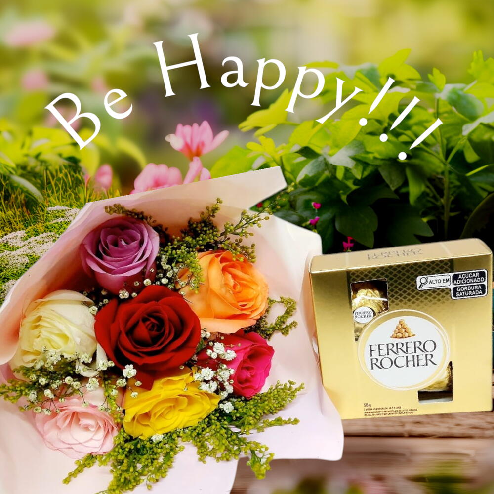 embalagem - 1 pcs folhagens - 1 pcs laço - 1 pcs caixa de bombom ferrero rocher 50gr - 1 pcs lindo buquê de rosa coloridas naturais (7 rosa) - 1 pcs