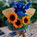 Buquê Love Stitch: arranjo com 3 girassóis, gipsófilas azuis e pelúcia do Stitch, acompanhado de cartinha personalizada. Ideal para aniversários, gestos de carinho, agradecimentos ou surpresas, simboliza alegria, serenidade e afeto. Combina beleza e emoção, tornando o presente único, memorável e capaz de alegrar o dia de quem recebe.