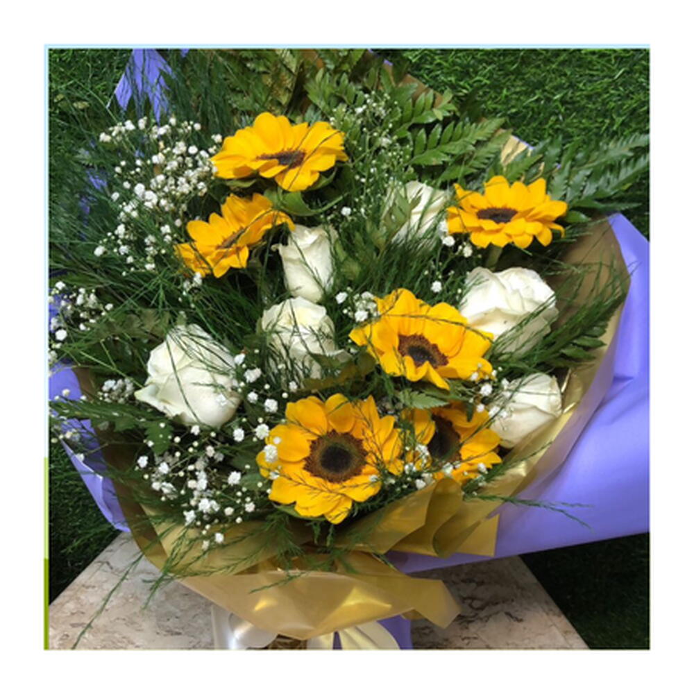 Este deslumbrante buquê possui uma harmoniosa combinação de flores, que o tornam uma peça única e especial. Composto por uma delicada gipsófila, seis girassóis vibrantes que transmitem alegria e positividade, e seis rosas brancas, símbolo de pureza e amor, este buquê é perfeitamente complementado por folhagens de aspargo e avencão, que agregam um toque de sofisticação e elegância. Ideal para a expressar sentimentos profundos ou abrilhantar momentos especiais.