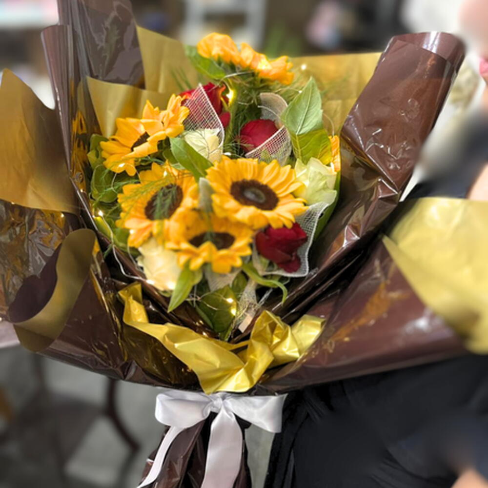 embalagem - 1 pcs girassol - 5 pcs rosa brancas - 3 pcs ruscos - 1 pcs rosa vermelhas - 3 pcs laço em cetim - 1 pcs
