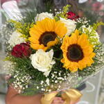 Este buquê encantador é composto por uma unidade de tango, acompanhada de duas unidades de girassóis vibrantes. O conjunto é embelezado ainda mais com cinco rosas brancas e quatro rosas vermelhas, acrescentando uma dose extra de sofisticação. Completando a composição, temos uma unidade de gipsófila e folhagens verdes, que trazem frescor e vivacidade ao buquê. Tudo é cuidadosamente envolvido em uma embalagem de celofane e amarrado com um laço gracioso, proporcionando o acabamento perfeito para este presente visualmente impressionante.