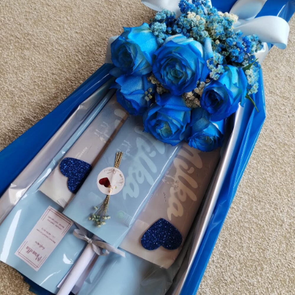 embalagem - 2 pcs laço - 1 pcs rosa azuis - 6 pcs barra de chocolate milka - 3 pcs folhagens em tom azul - 1 pcs embalagens personalizadas milka - 3 pcs