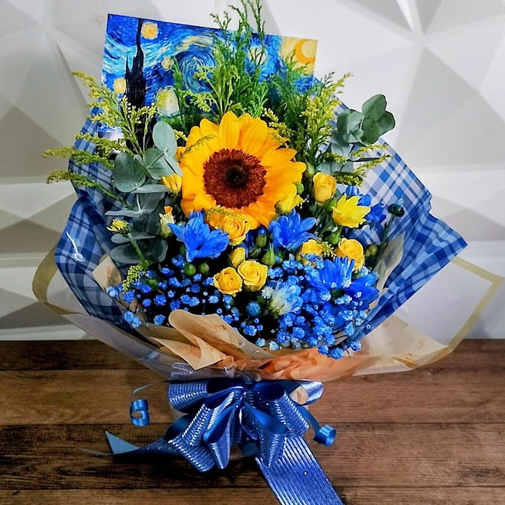 embalagem de designer - 1 pcs girassol - 1 pcs gypsofila - 1 pcs laço - 1 pcs cartão de mensagem - 1 pcs art impresso van gogh - 1 pcs flores do campos azul e amarela hastes - 2 pcs tango haste - 1 pcs