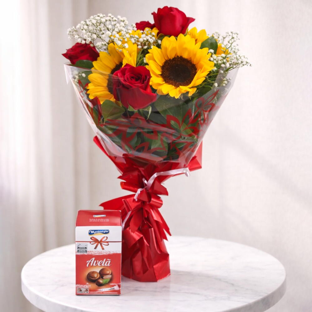Descubra o presente perfeito para alguém especial com este encantador Presente com chocolate. Combina uma exuberante seleção de rosas vermelhas e girassóis, complementados por belas folhagens para uma apresentação verdadeiramente deslumbrante. Encorpore ainda mais doçura com 4 deliciosas trufas gourmet incluídas no pacote. Este presente vem elegantemente embalado em uma caixa sofisticada, finalizada com um lindo laço. Seja para aniversários, aniversários ou simplesmente porque sim, este Presente com chocolate é a expressão perfeita de amor e carinho.