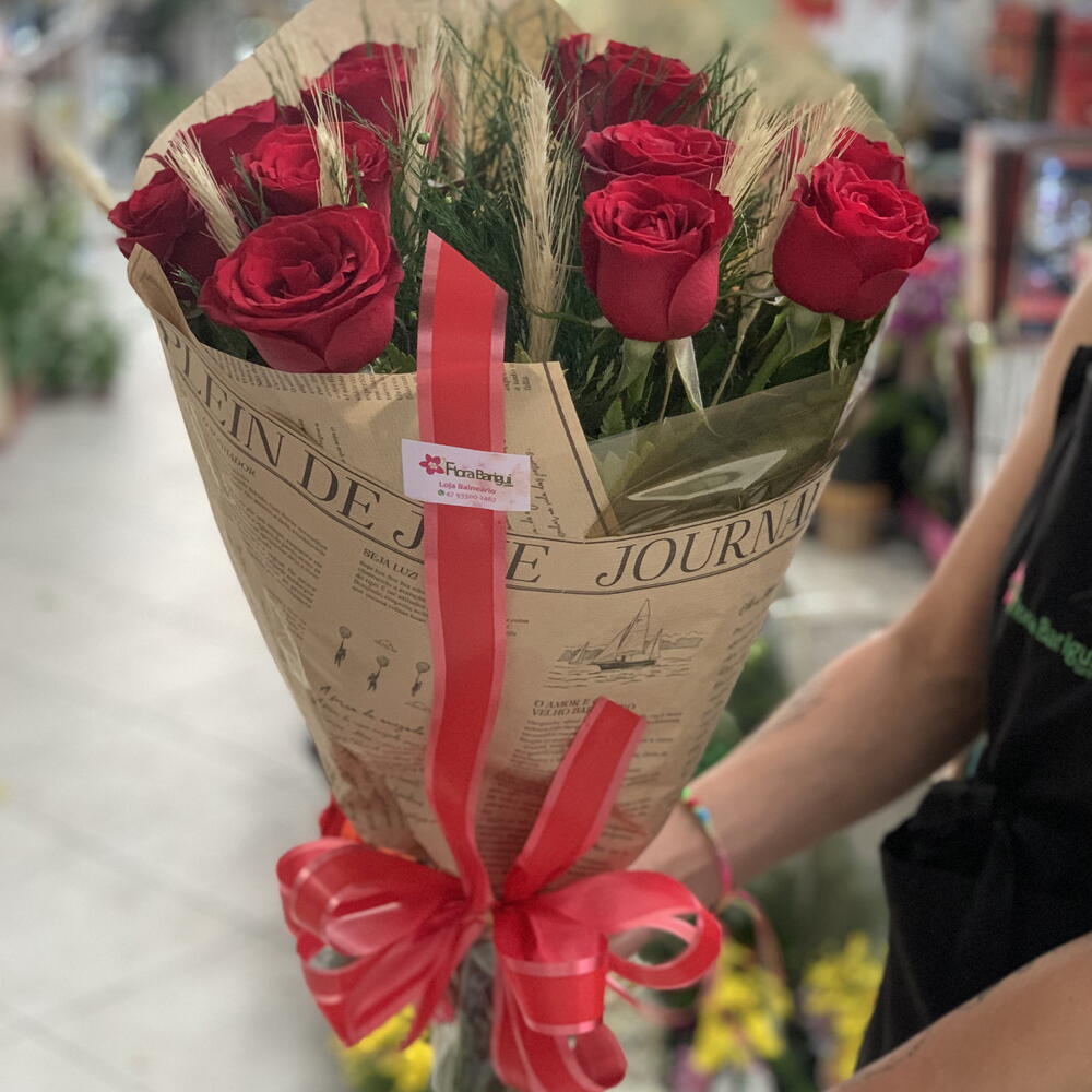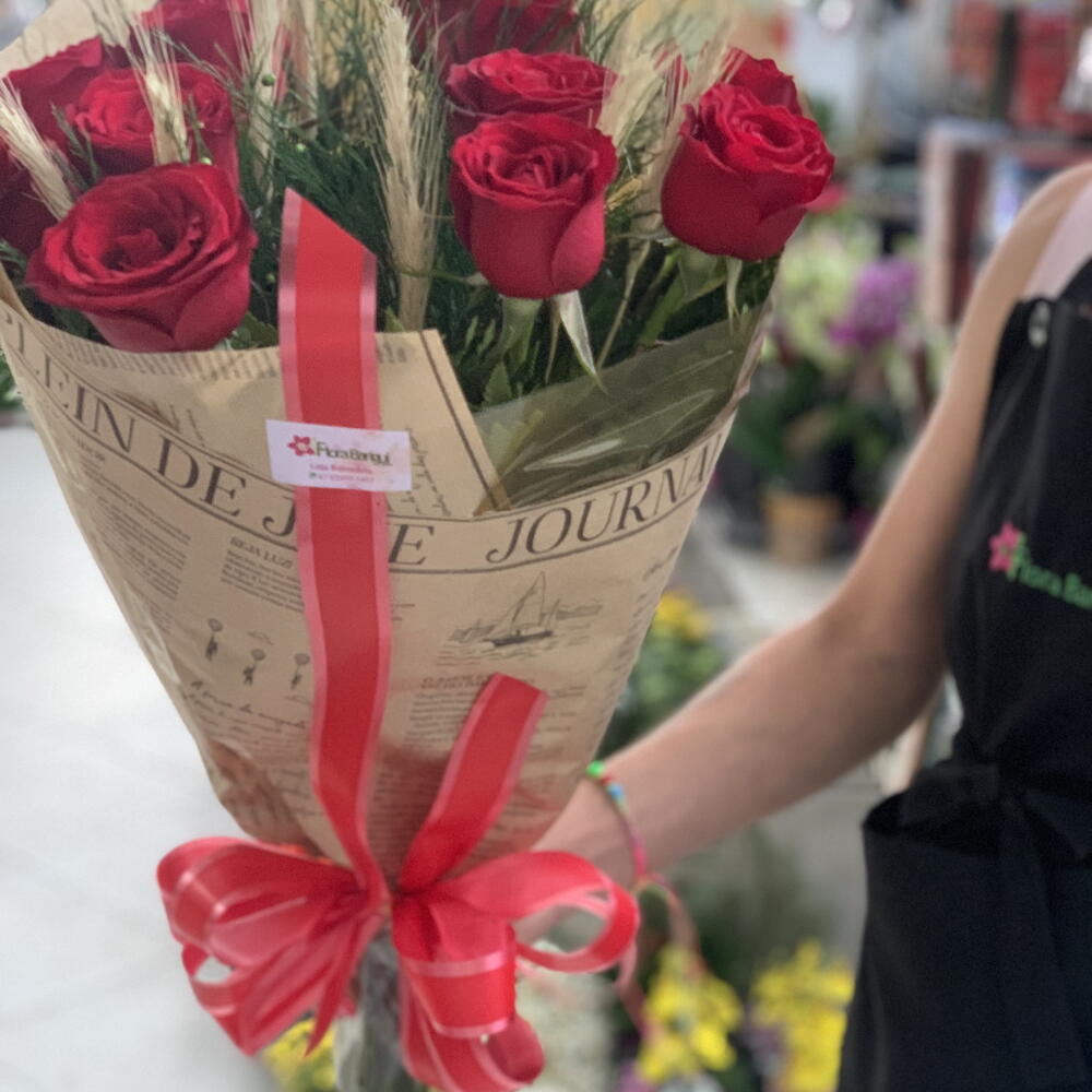 Envoltas em jornal estilo frances são 12 lindas rosas colombianas, com ramos de trigo para simbolizar a riqueza do amor...