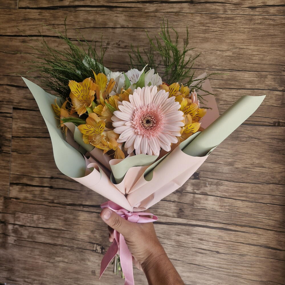 Este encantador buquê é composto por doze unidades de flores variadas, realçadas por uma folhagem luxuosa. A disponibilidade de flores pode ser verificada por meio de nosso chat online. Cada buquê é artisticamente arranjado e embrulhado em uma embalagem de design exclusivo. O toque final é dado por um delicado laço, criando um presente perfeito para todos os tipos de ocasiões.