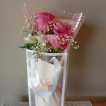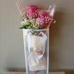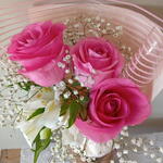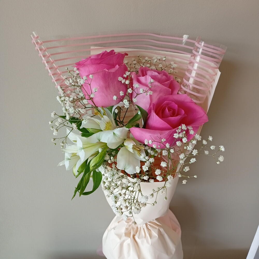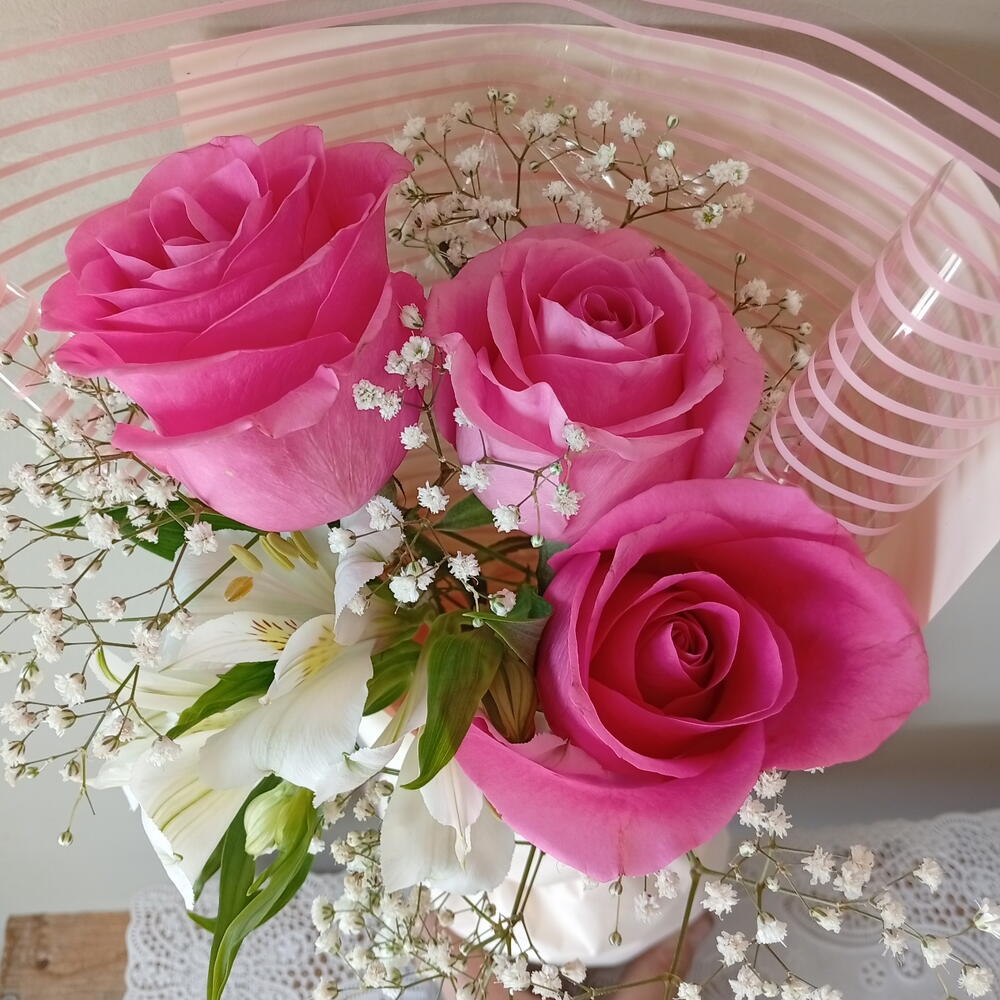 rosa - 3 pcs gypsophila - 1 pcs astromelia branca - 1 pcs embalagem elegante rosa e creme - 1 pcs