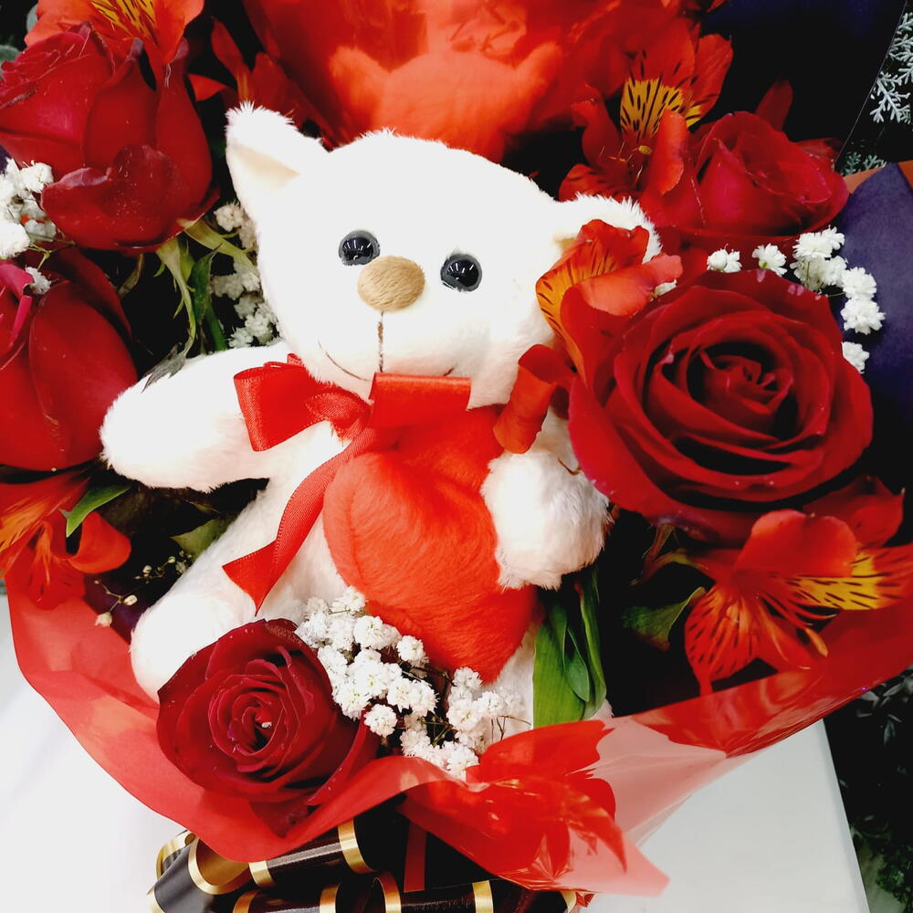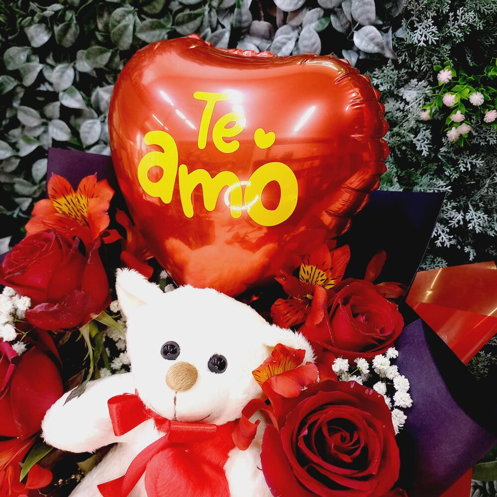 Buquê Amor em Forma de Surpresa Declare seu amor com um presente que fala por si só. Este buquê encantador une a beleza das rosas vermelhas importadas ao carinho de um ursinho de pelúcia, acompanhado de um balão em formato de coração com a mensagem Te Amo. Com flores selecionadas, detalhes apaixonantes e acabamento impecável, é a escolha perfeita para celebrar o amor em qualquer ocasião especial.