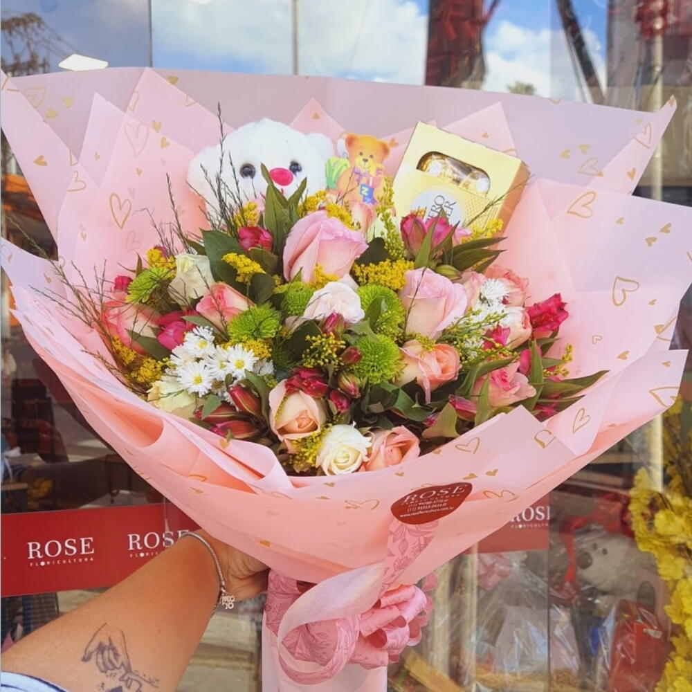 Este lindo presente combinado, oferece uma seleção cuidadosamente escolhida de delícias indulgentes. Dentro de uma sofisticada embalagem, você encontrará uma exuberante caixa com 100g do mais fino Ferrero Rocher. O buquê de flores, composto por 12 astromérias roxas exóticas, 10 rosas botão cor de rosa suaves e 5 rosas botão brancas delicadas, será apreciada pelo seu destinatário. Além disso, uma adorável pelúcia de 10cm é a cereja no topo deste incrível presente. Com o laço anexado, é um presente pronto para entregue e vai trazer um sorriso ao rosto de quem receber.