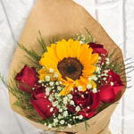 Um buquê apaixonante! 😊 Um buquê romântico e apaixonado, composto por 5 rosas vermelhas e 1 girassol. As rosas vermelhas, com suas pétalas aveludadas e cor intensa, simbolizam o amor e a paixão, enquanto o girassol adiciona um toque de alegria e otimismo. Juntas, essas flores criam um arranjo irresistível e significativo, perfeito para expressar sentimentos profundos e declarar amor. 💐