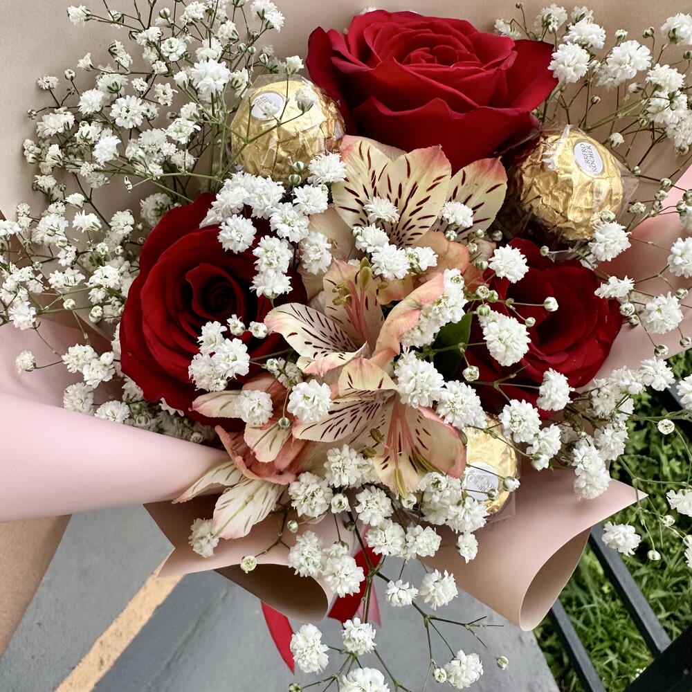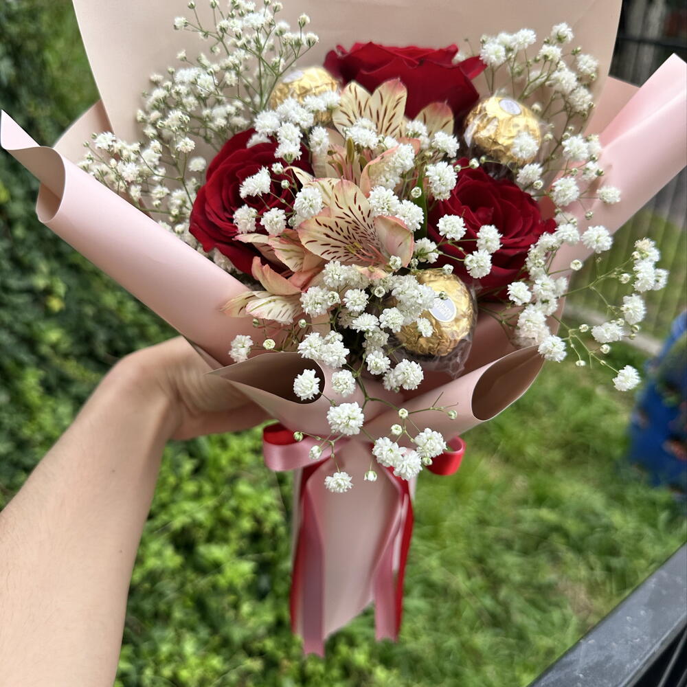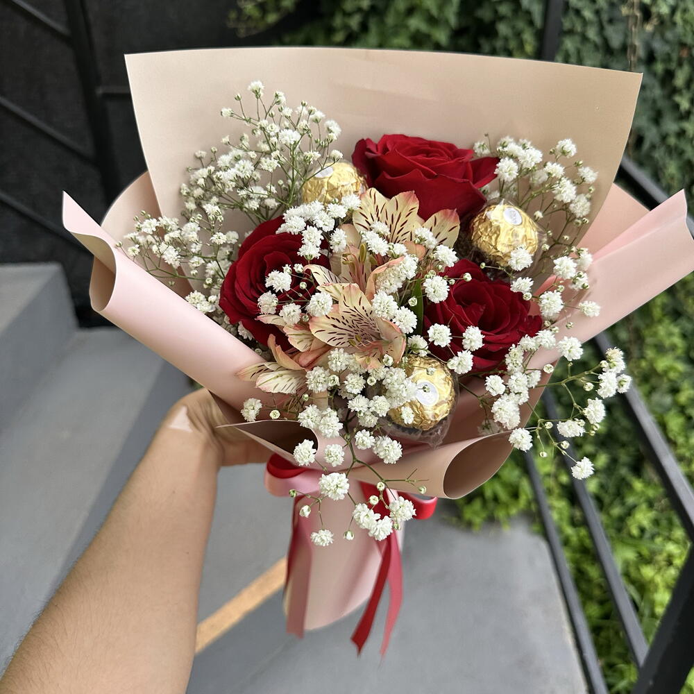 gypsophila - 1 pcs bombons ferrero rocher - 3 pcs embalagem e laço - 1 pcs rosa naturais vermelhas - 3 pcs