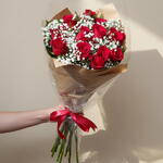 Este buquê de flores finamente preparado é uma mistura elegante de 12 rosas vermelhas esplêndidas, habilmente adornadas com delicada gipsofila para adicionar um toque de sofisticação. O arranjo é cuidadosamente embalado em uma embalagem de bom gosto e amarrado com um lacinho bonito para dar aquele toque final perfeito. Para completar, a presença sutil de folhagens confere ao buquê um aspecto fresco e natural. Este buquê é a expressão perfeita de luxo sereno e estilo atemporal.