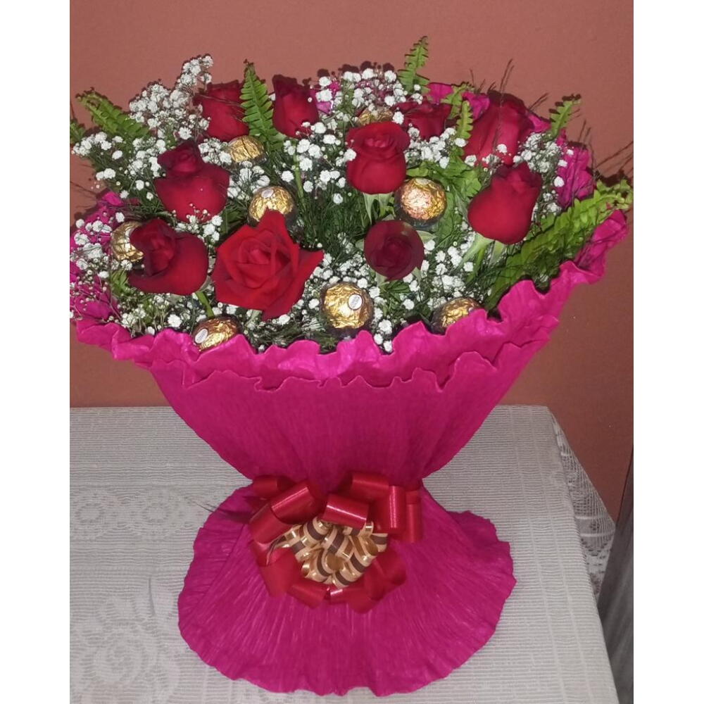 Lindo buquê para presentear alguém muito especial com rosas vermelhas e bombons Ferrero Rocher.Gipsofila e folhagens em Sua Composição, Envolvida em papel crepon italiano e laço Bola.