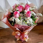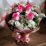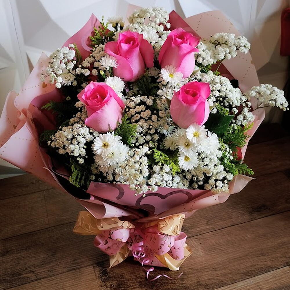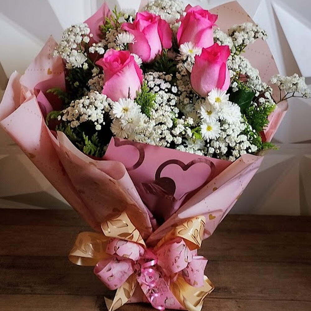 Este delicado buquê reúne a suavidade e o romantismo das rosas cor-de-rosa em perfeita harmonia com a leveza do mosquitinho branco e o charme das margaridinhas. O arranjo é cuidadosamente envolto em um papel rosado decorado com corações, transmitindo ternura e afeto, finalizado com um laço duplo em tons de rosa e dourado que dá um toque de elegância especial. É o presente ideal para expressar carinho, gratidão ou amor em momentos únicos, transmitindo beleza, sofisticação e sentimentos verdadeiros em cada detalhe.