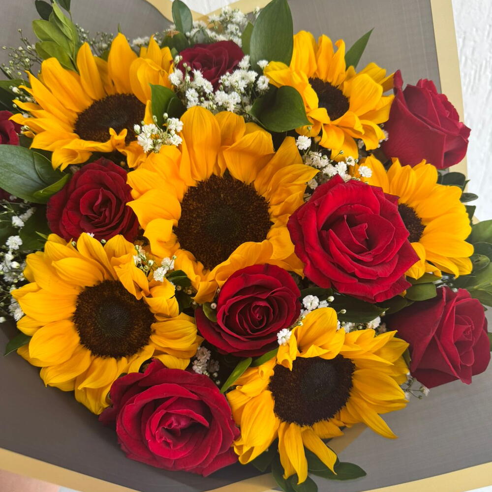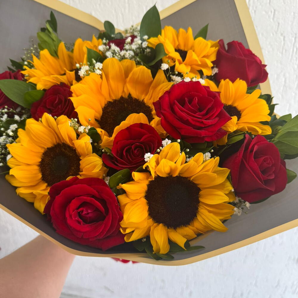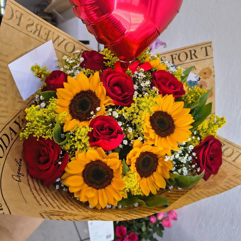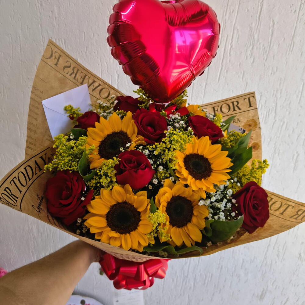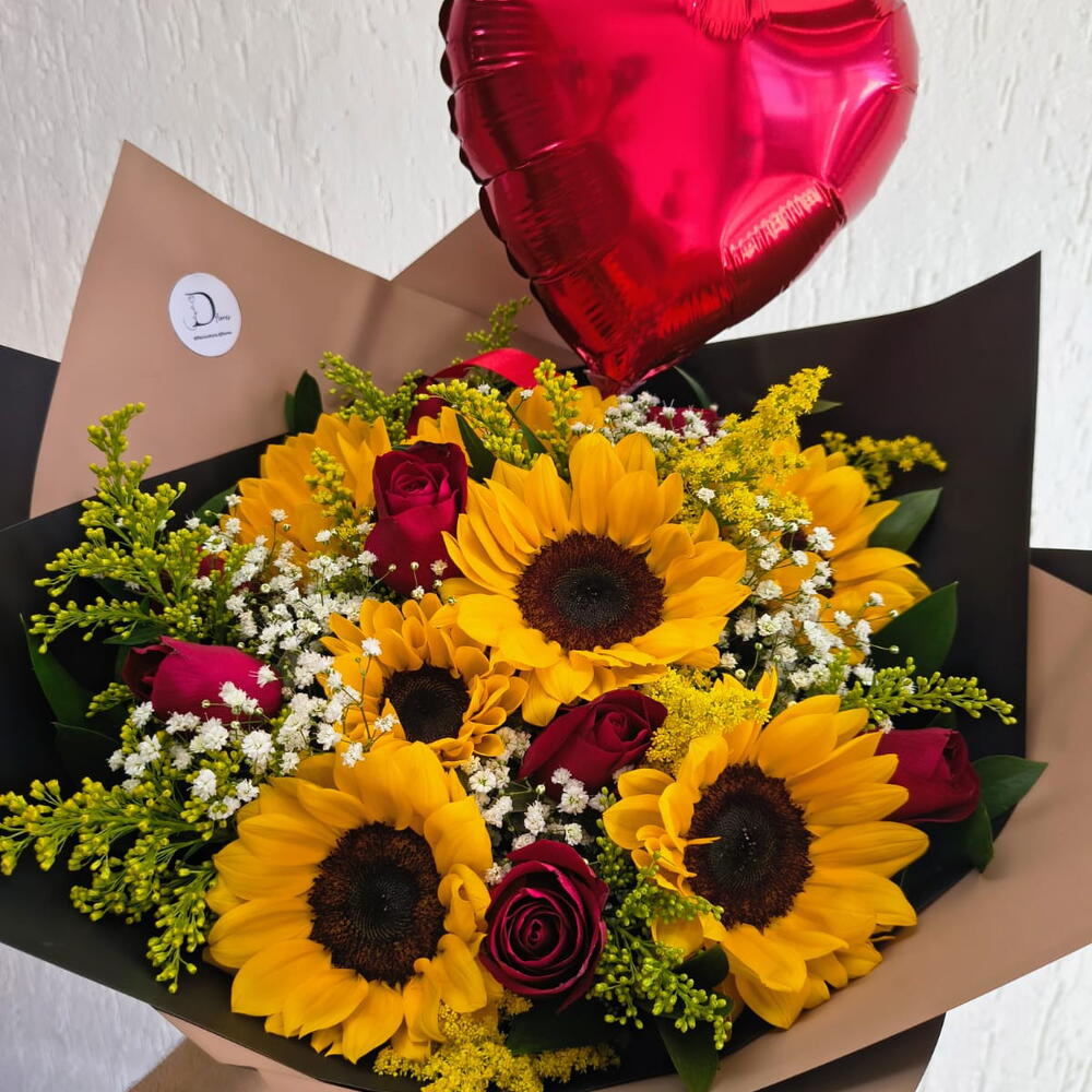 Surpreenda alguém especial com este luxuoso buquê composto por 10 unidades de exuberante folhagem, 6 sois radiantes sob a forma de girassóis e 8 unidades de rosas vermelhas, símbolo clássico do amor profundo. Acompanha também um encantador balão de coração para fazer o gesto ainda mais doce e significativo. Este arranjo inaudível é apresentado em uma embalagem moderna com um laço delicado para adicionar aquele toque extra de personalização. A combinação perfeita para segurar o coração de alguém com elegância e estilo.