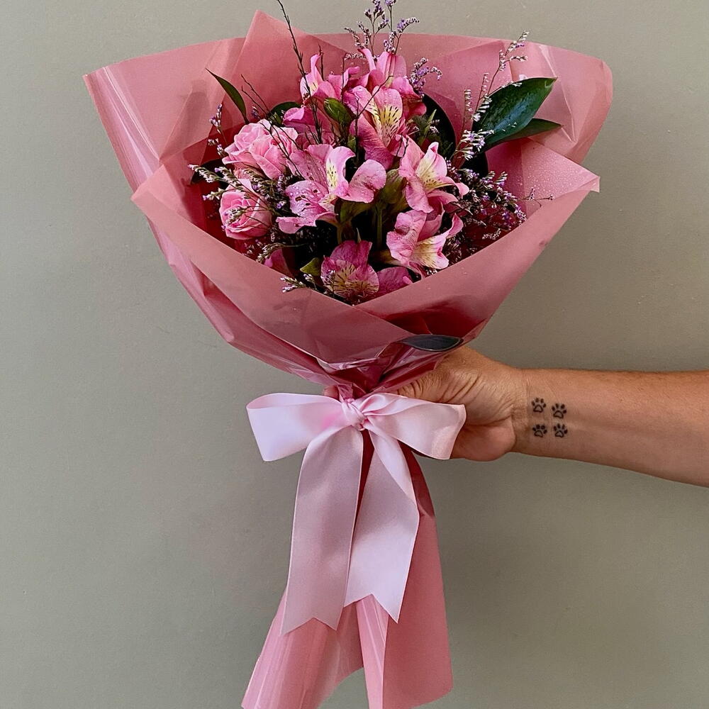 Buquê com astromélias naturais em tons de rosa, combinadas com folhagens verdes e flores de campo delicadas. Montagem cheia, leve e bem distribuída, finalizada com embalagem rosada e laço em cetim. Astromélia é flor de presença e boa durabilidade. Um buquê versátil, bonito e fácil de agradar. Indicado para: • Aniversário • Presente carinhoso • Datas especiais • Quem gosta de flor delicada, mas marcante Informações importantes: – Flores naturais e frescas – Produção artesanal – Variações podem ocorrer conforme a sazonalidade – Foto ilustrativa do padrão de montagem