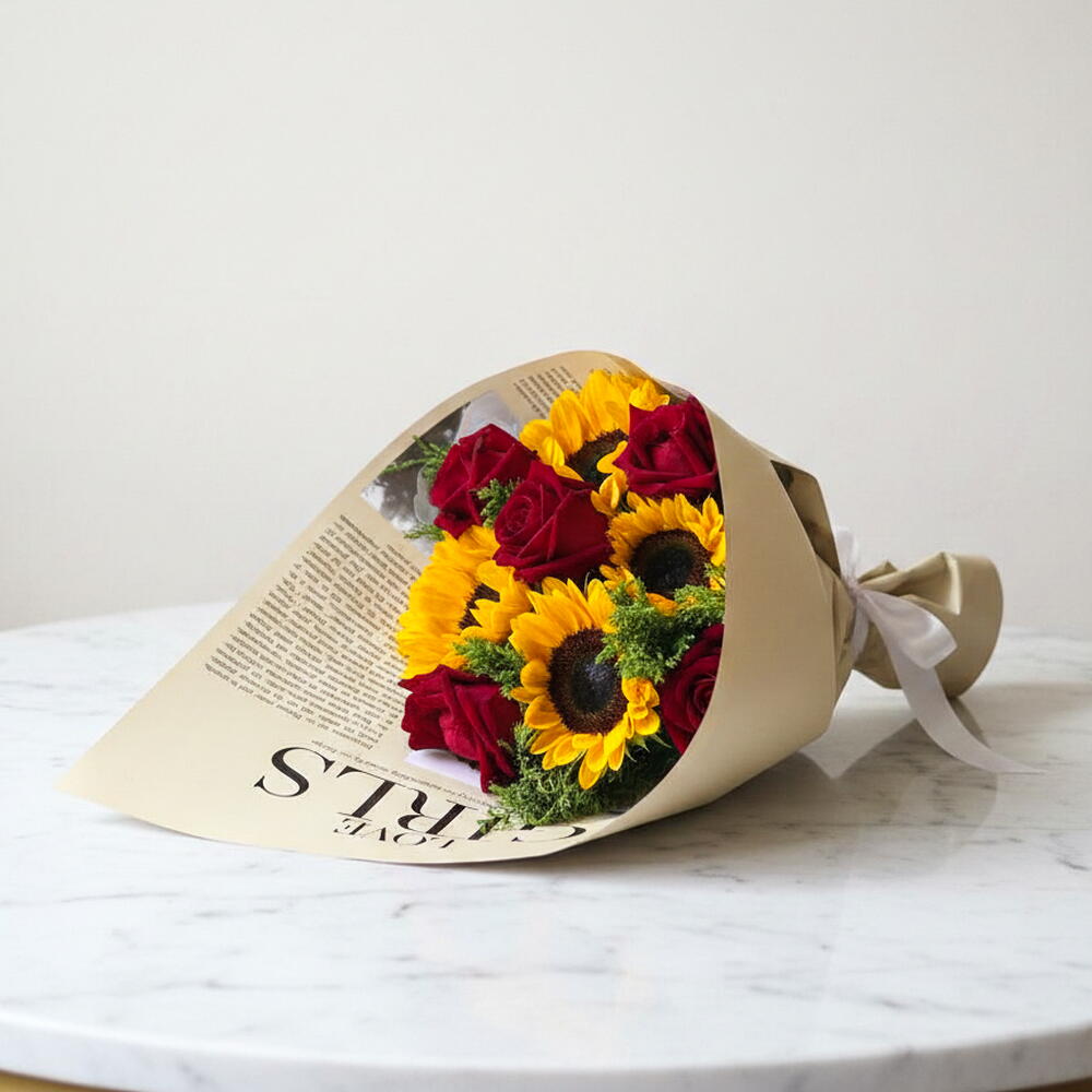 Este buquê deslumbrante é composto por 5 rosas vermelhas vibrantes e 5 girassóis radiantes, harmoniosamente integrados com elegantes folhagens. O arranjo é carinhosamente embalado e decorado com um laço delicado. Perfeito para demonstrar seu amor e apreço em qualquer ocasião.