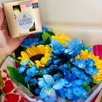 Este encantador presente combina o requinte de chocolates Ferrero Rocher com a beleza e frescura das flores girassóis e astromélias azuis. Composto por quatro unidades de girassóis, cuatro unidades de Ferrero Rocher, cinco unidades de astromélias azuis, todos cuidadosamente embalados e finalizados com um lindo laço. Este presente é a opção perfeita para surpreender e encantar um ente querido.