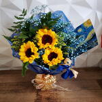 embalagem - 1 pcs folhagens - 5 pcs girassol - 3 pcs gypsofila - 4 pcs laço - 2 pcs tango galhos - 5 pcs