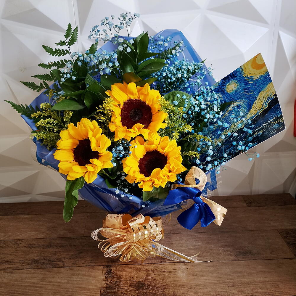 embalagem - 1 pcs folhagens - 5 pcs girassol - 3 pcs gypsofila - 4 pcs laço - 2 pcs tango galhos - 5 pcs