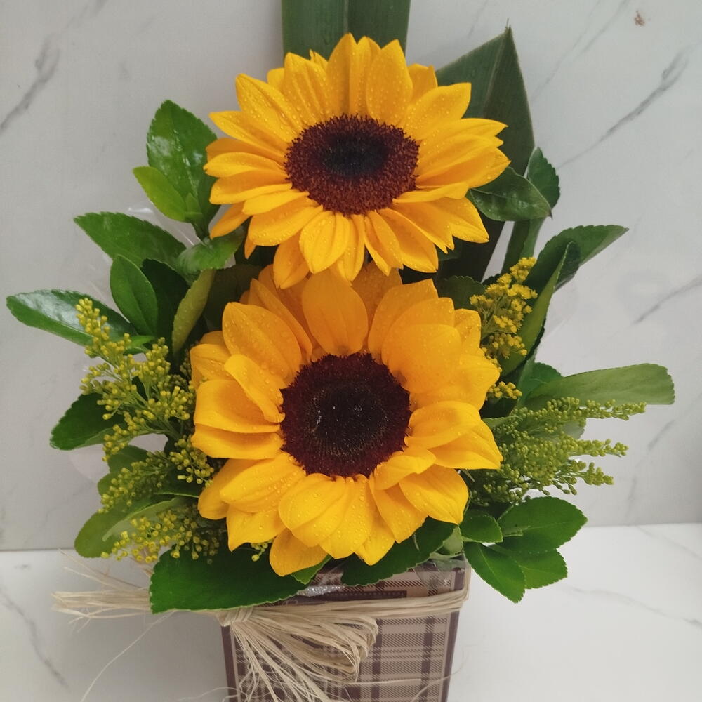 Este deslumbrante arranjo de flores é composto por 2 girassóis radiantes, cuidadosamente dispostos num cachepô sofisticado. A beleza natural é ainda mais realçada por um laço rústico, adicionando um toque de elegância e simplicidade. Este arranjo é a combinação perfeita de beleza e charme rústico.