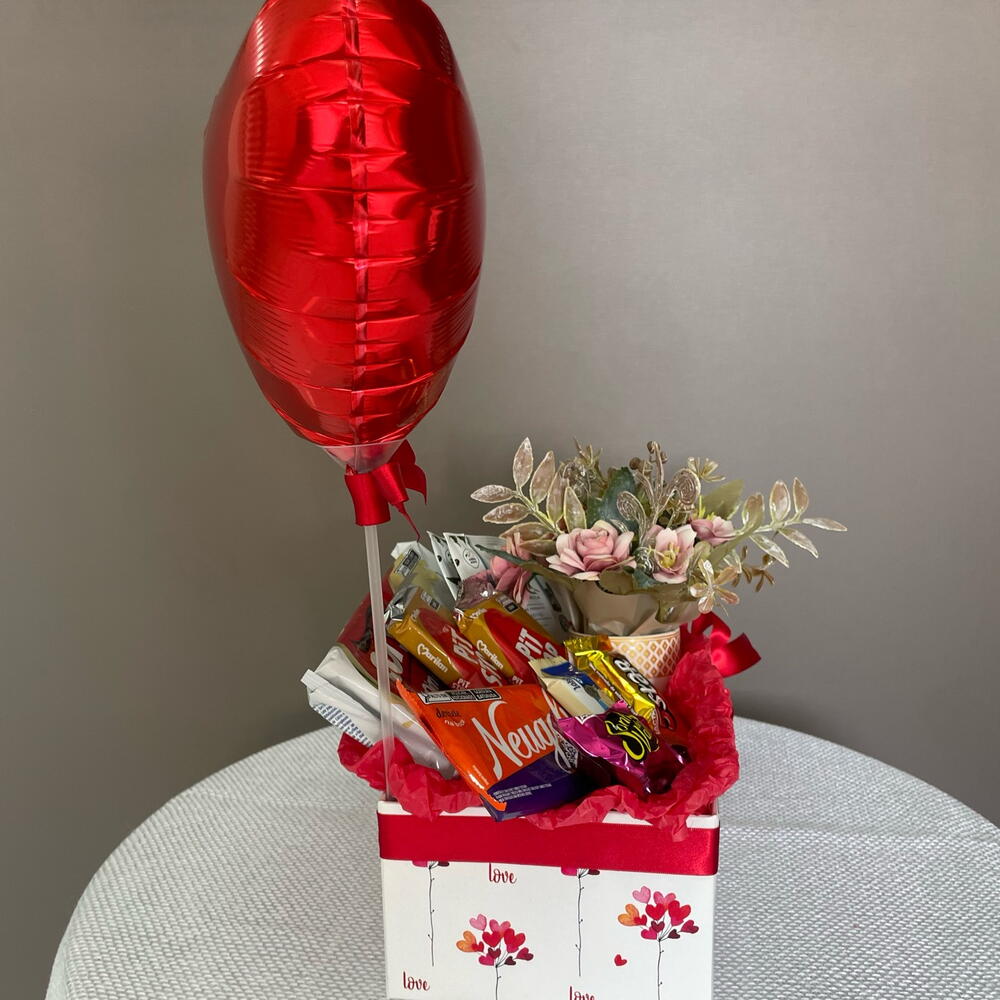 box decorada - 1 pcs pit stop - 2 pcs bombons sortidos - 3 pcs drip coffee (café individual) - 2 pcs balão metalizado pequeno - 1 pcs pão de mel cory 90g - 1 pcs barra de chocolate 75g - 1 pcs mini buquê na xícara - 1 pcs